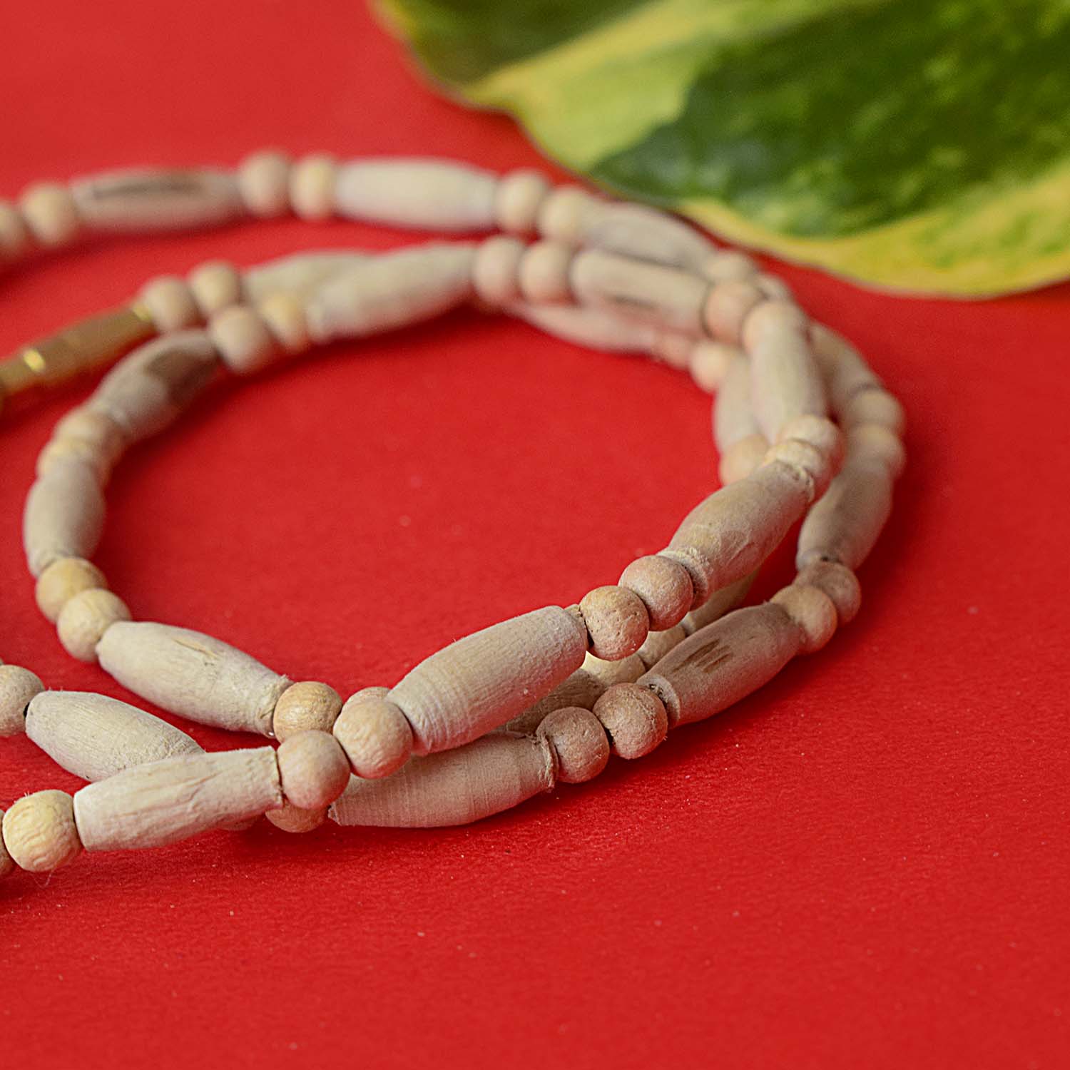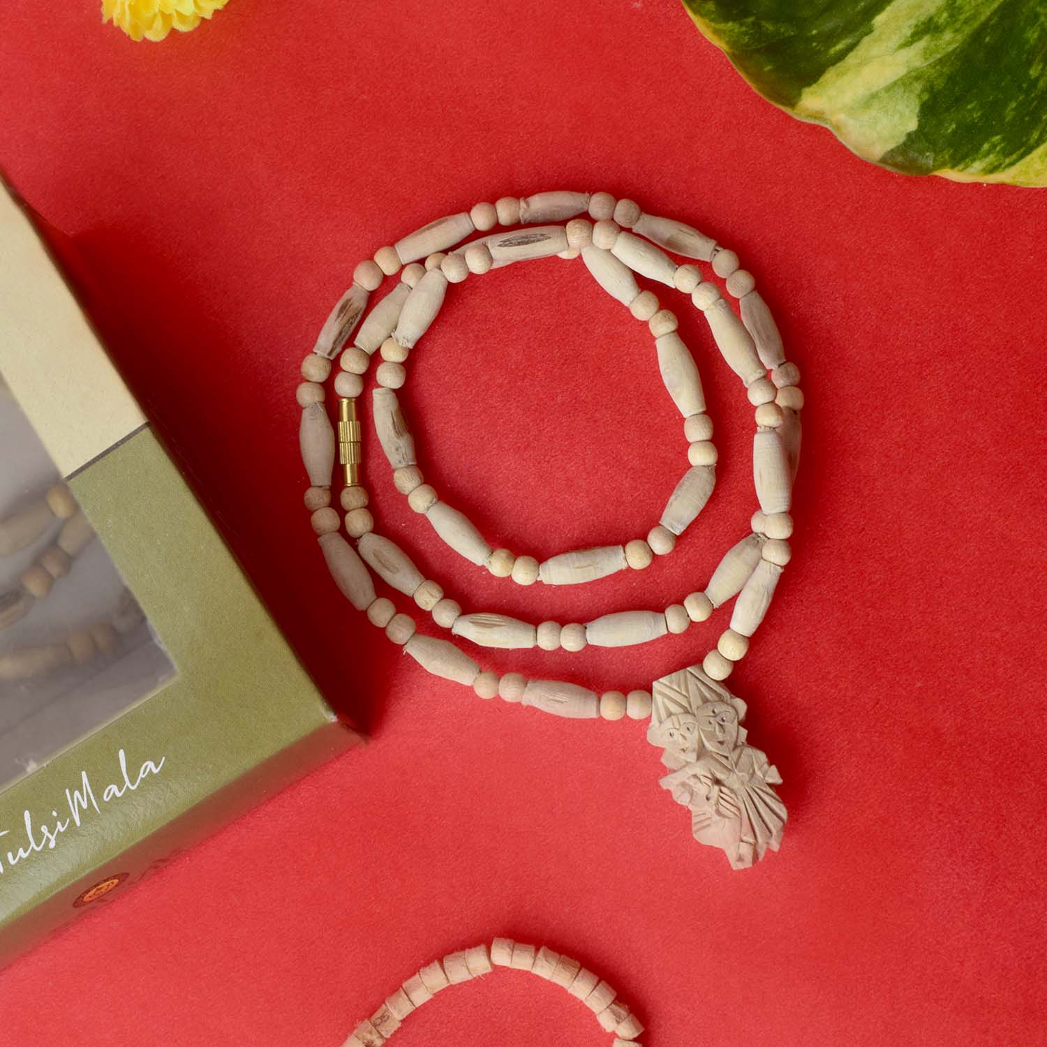 A Tulsi Mala is a string of beads made from the wood of the sacred Tulsi plant (Ocimum sanctum). It is widely used in Hinduism, Jainism, and Buddhism for chanting (Japa) and wearing as a protective necklace. The power of Tulsi Mala is believed to enhance spirituality, bring inner peace, and protect the wearer from negative energies.