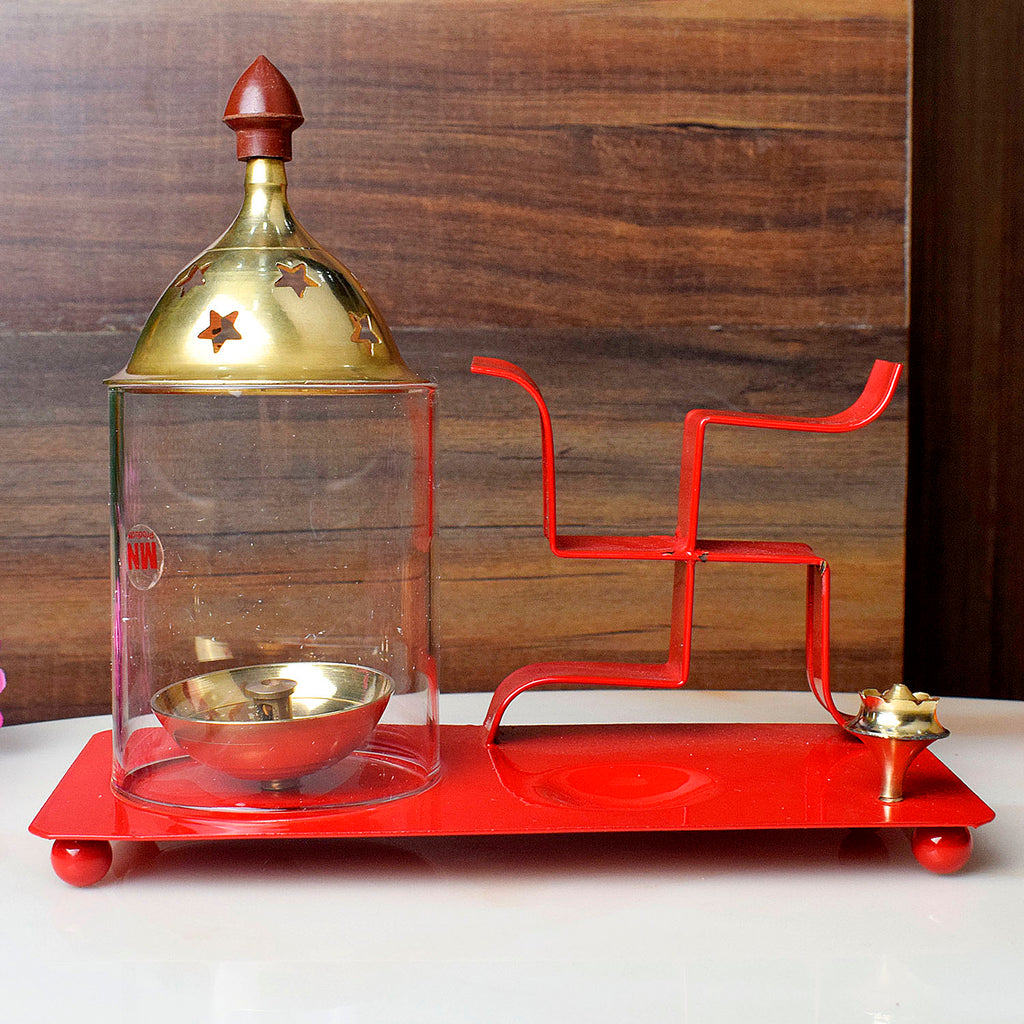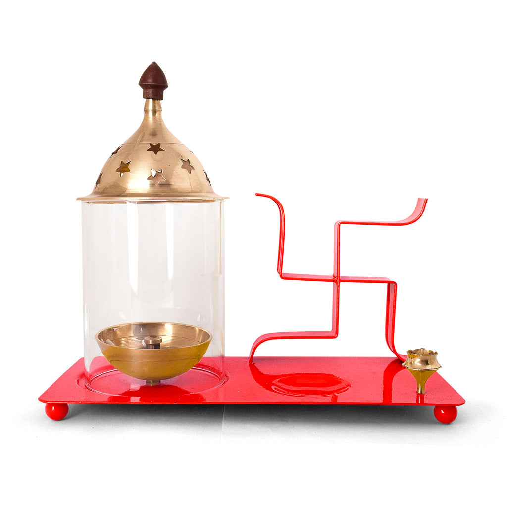 Brass & Metal Swastik Chimney Diya Tray with Incence Holder Small (Red)