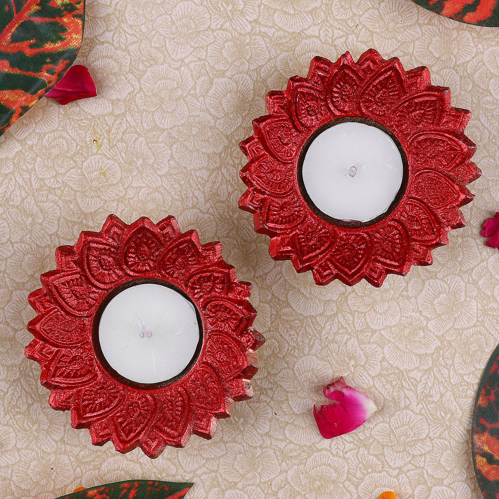 • Item Name: Set of 2 Pc Designer Red Floral Shape Metal Diya and 2 Pcs of Candle Tea Lights. Each Comes with Premium Gift Packing.