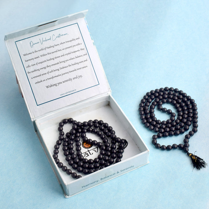 About Product: Hakik Jap Mala (Black Tourmaline) – A Shield of Protection & Energy Purification