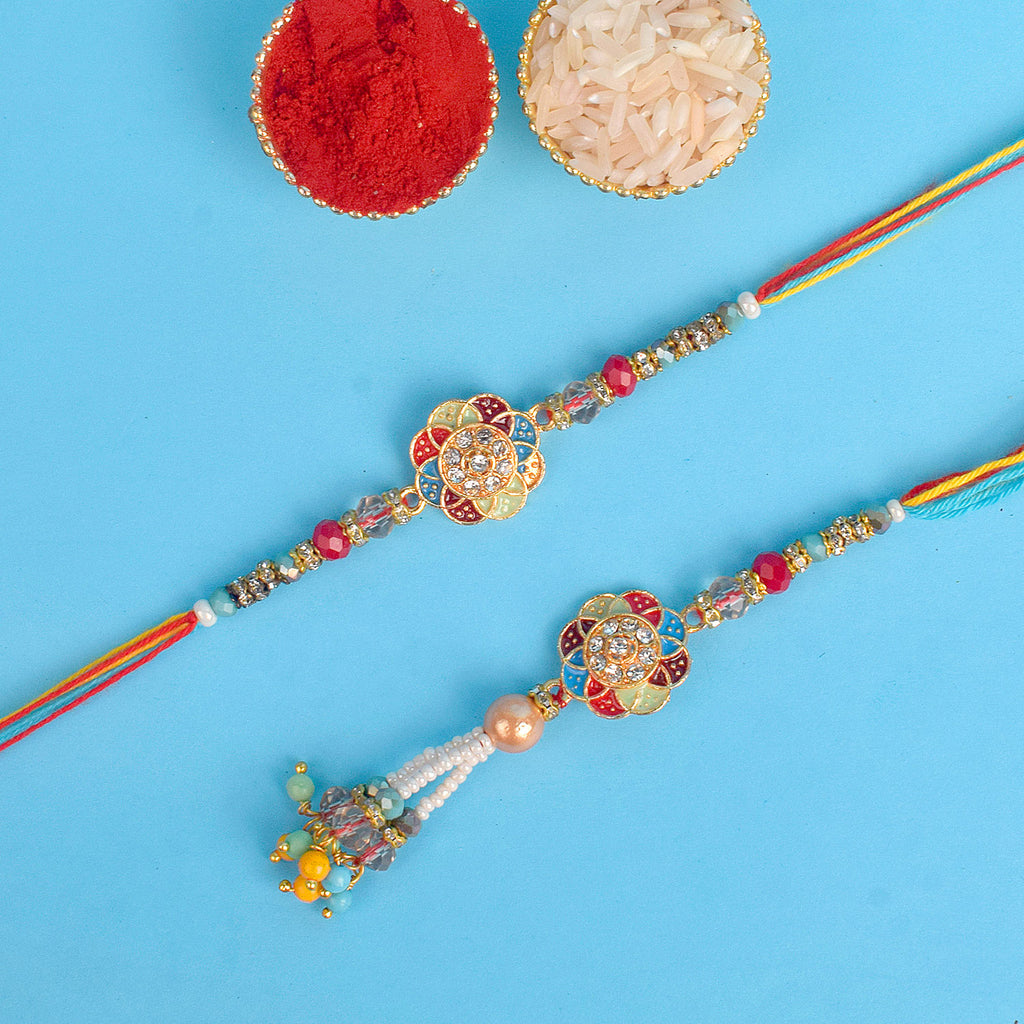 • Package: 1 Men Rakhi, 1 Women Lumba Rakhi, Roli Chawal Pack, Ram & Sita Theme Stickers