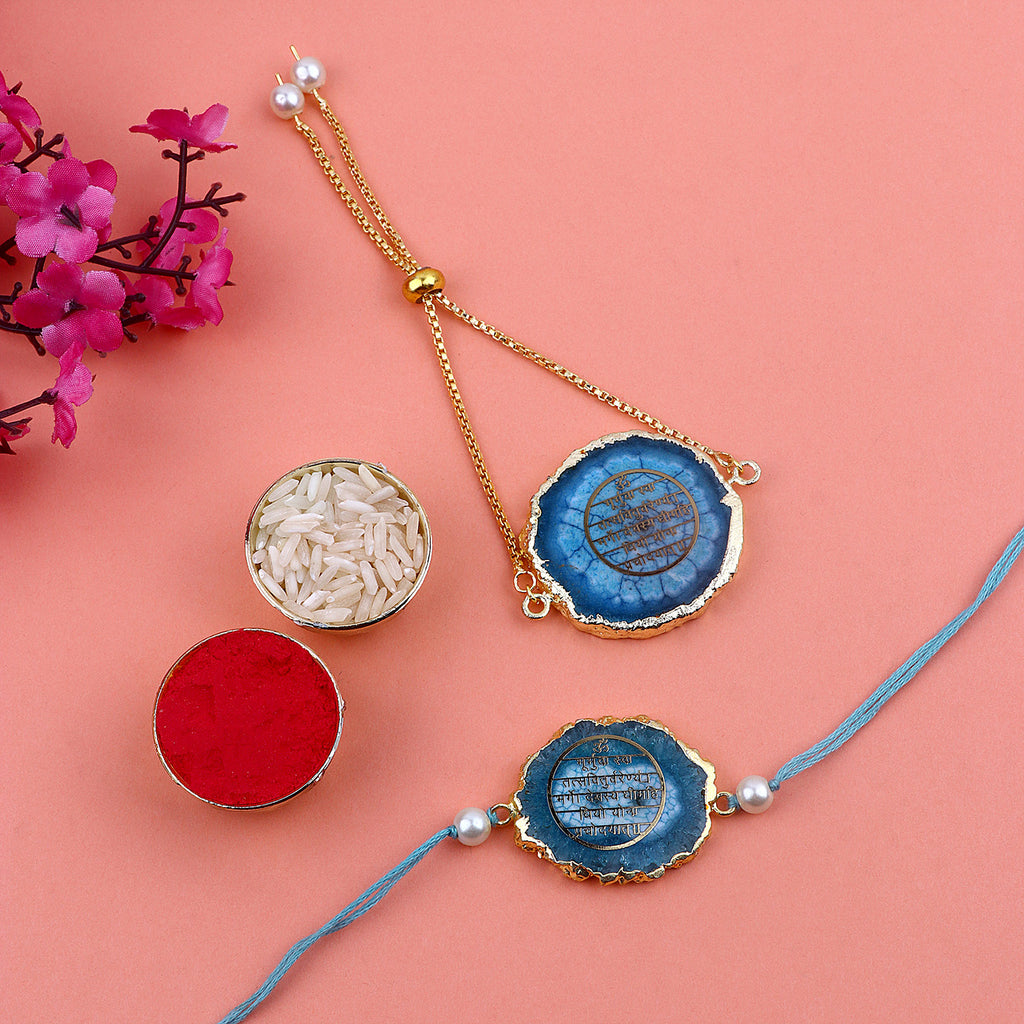 For those looking for a touch of elegance and uniqueness, our Agate Stone Bhaiya Bhabhi Rakhi collection is an ideal choice. The Agate stone, with its mesmerizing patterns and vibrant hues, adds a touch of sophistication and charm to these Rakhis. The Agate Stone Bhaiya Bhabhi Rakhi set is a perfect blend of spirituality, style, and protection, symbolizing the divine blessings and the unbreakable bond between the couple.