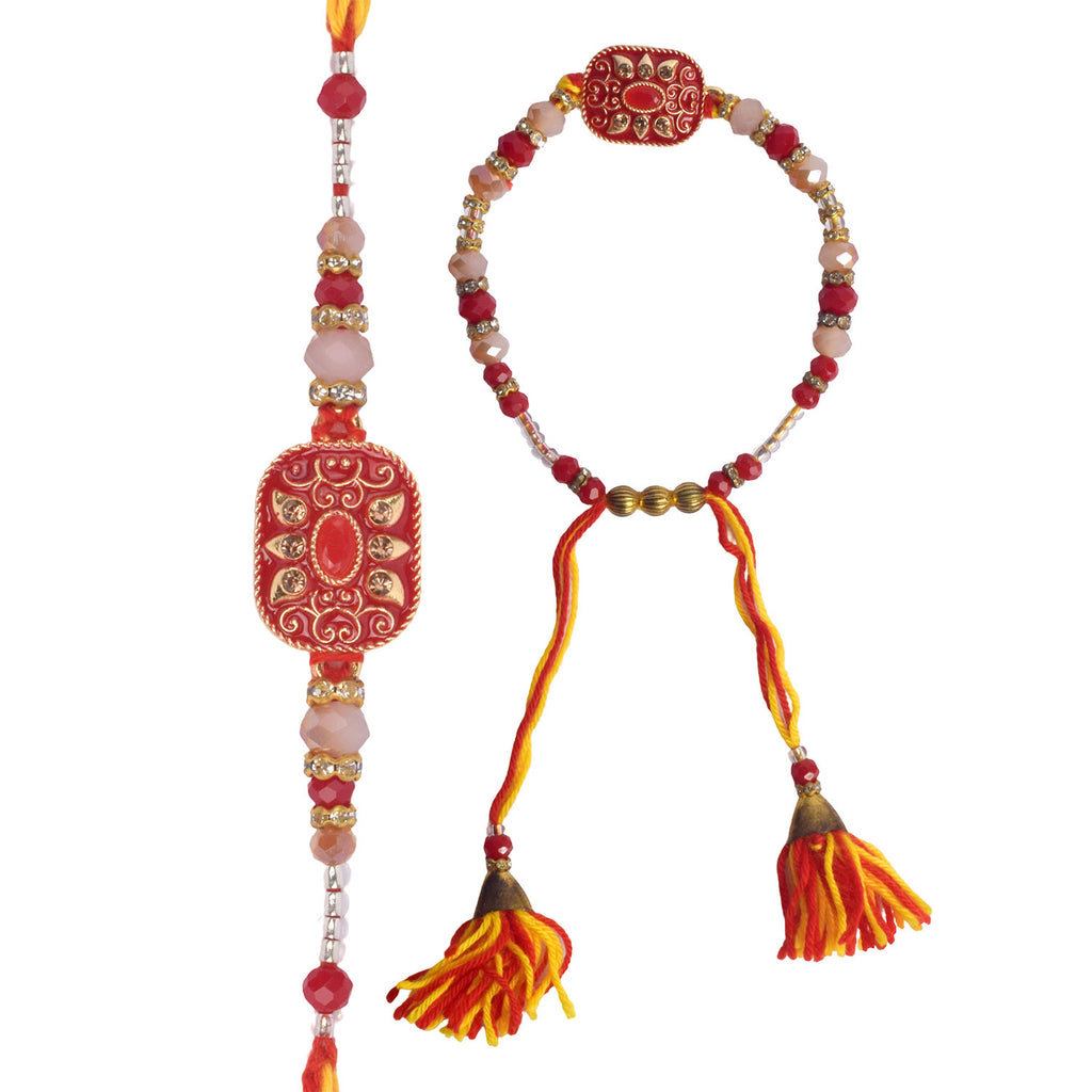 • Package: 1 Men Rakhi, 1 Women Lumba Rakhi, Roli Chawal Pack, Ram & Sita Theme Stickers