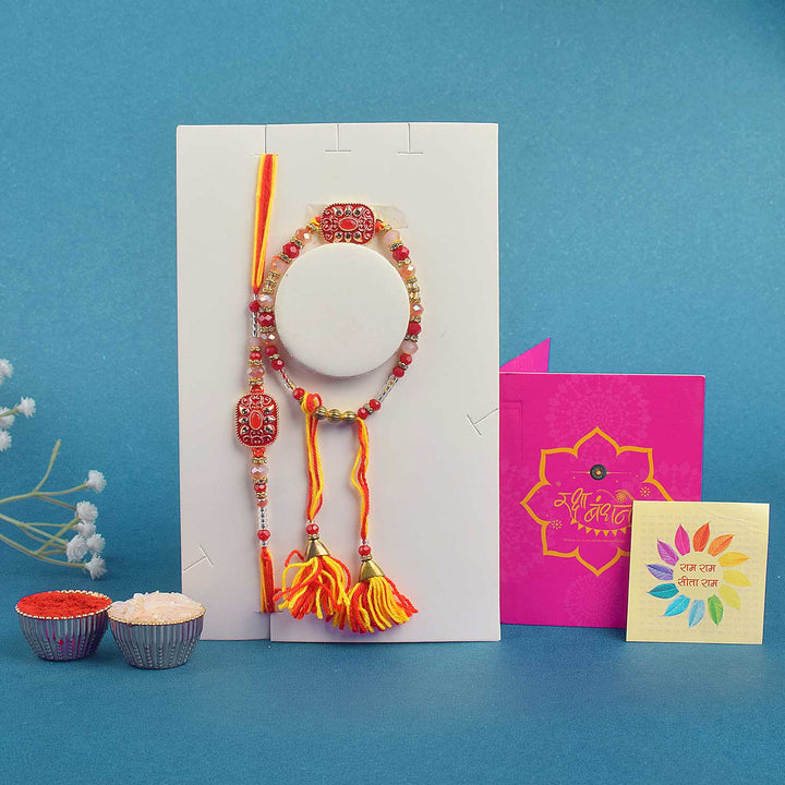 • About Product: Celebrate the eternal bond of love and tradition with this beautifully crafted Couple Rakhi Set designed for Bhaiya and Bhabhi. The men’s rakhi is bold and elegant, while the women’s lumba is graceful and festive—perfectly complementing each other as a symbol of togetherness.