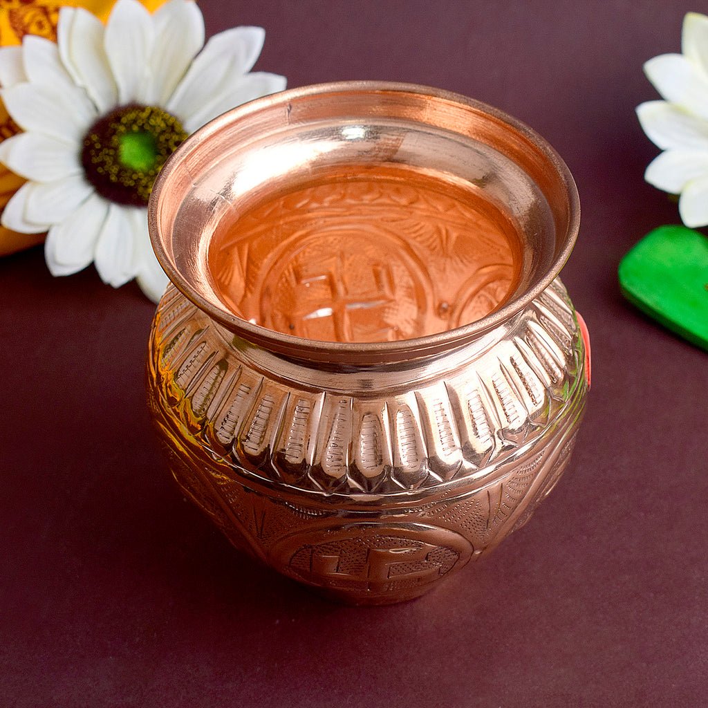 About Product: Satvik's Pure Copper Ayurvedic Lota Prayer Vassel indian traditional Kalash for home and temple.At this time when the world is riddled with pollution, our countrymen are using high potency tablets even for minor problems which is spreading poision in their bodies. Our Rishis, saints and even doctors have found a very easy method to deal with such disorders. The best remedy to overcome these problems is to store water in a Copper utensil overnight and drink four glasses every morning. Material & Design: Made from High Quality Copper to Maintain the Ayurvedic Value of the Kalash / Lota/ Vessel/ Tumbler. OM, Swastik, Shubh Labh, Kalash Is beautifully Engraved on the Lota.