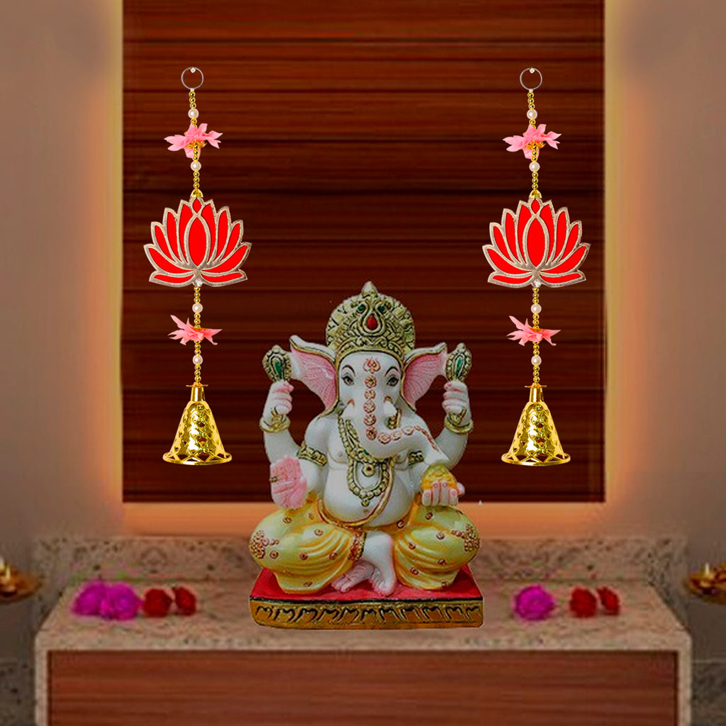 About Product: Add a beautiful traditional touch to your walls with this 1 Tier Lotus with Bells Wall Hanging Backdrop (1 Pair Latkans). Each piece features an elegant acrylic sheet lotus, shining golden bells, and decorative beads, creating a vibrant and festive vibe in any corner of your home.
