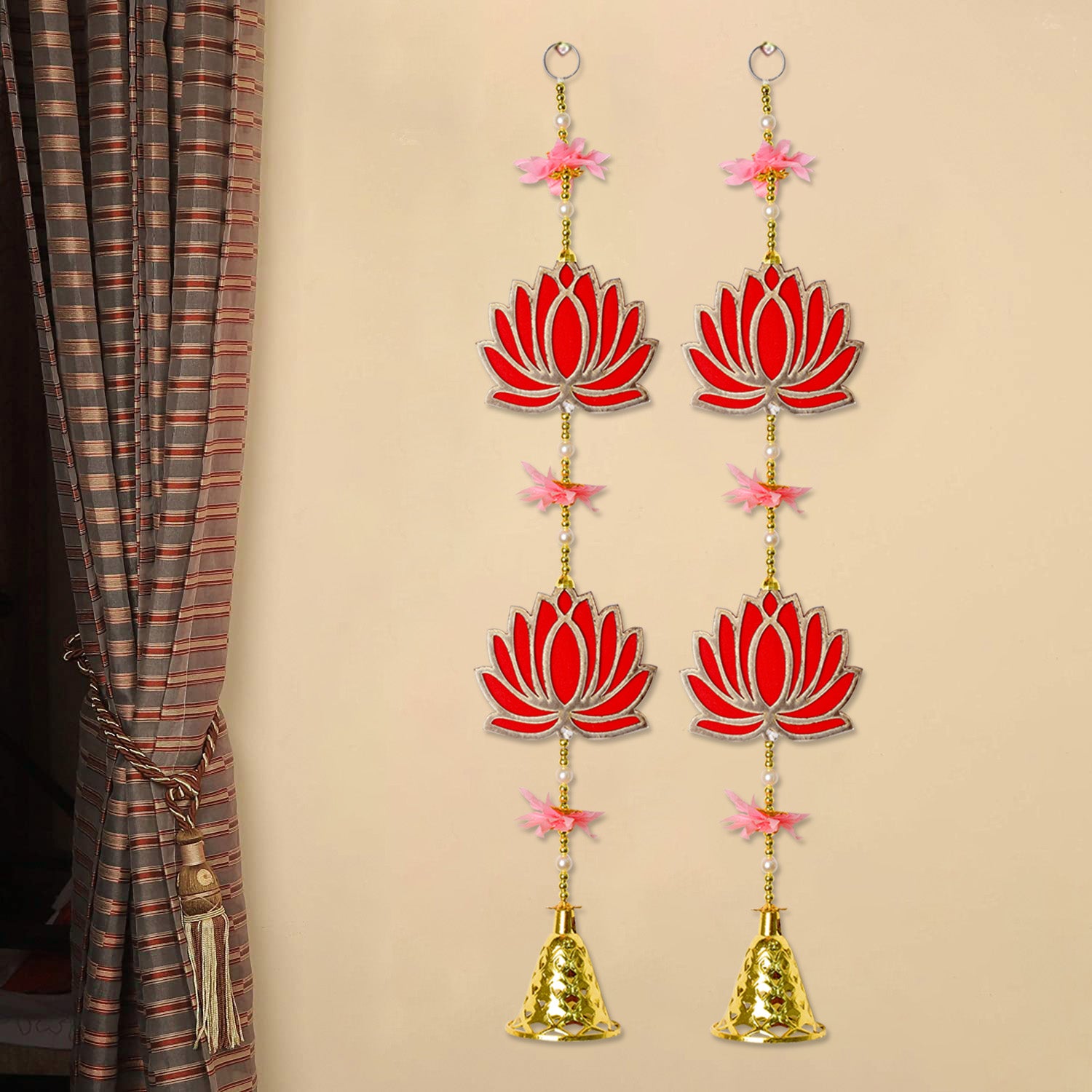 Decorate your home with a festive and spiritual vibe using this 2 Tier Lotus with Bells Wall Hanging Backdrop (1 Pair Latkans). Made with elegant acrylic sheet lotus designs, shiny golden bells, and beautiful beads, this hanging brings a rich, layered look to your walls or door frames.