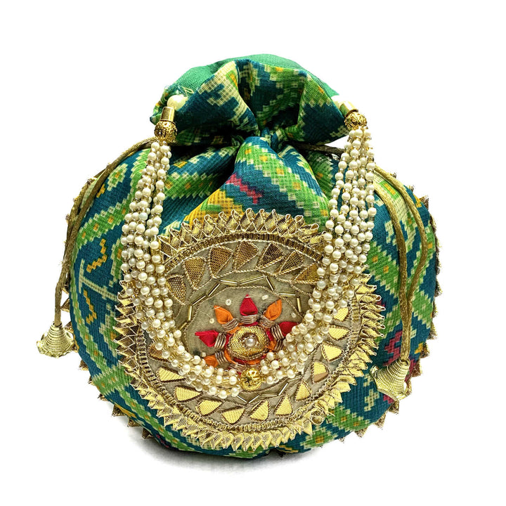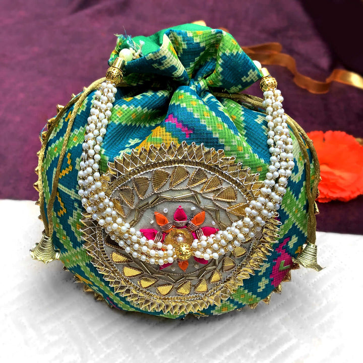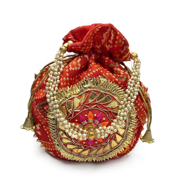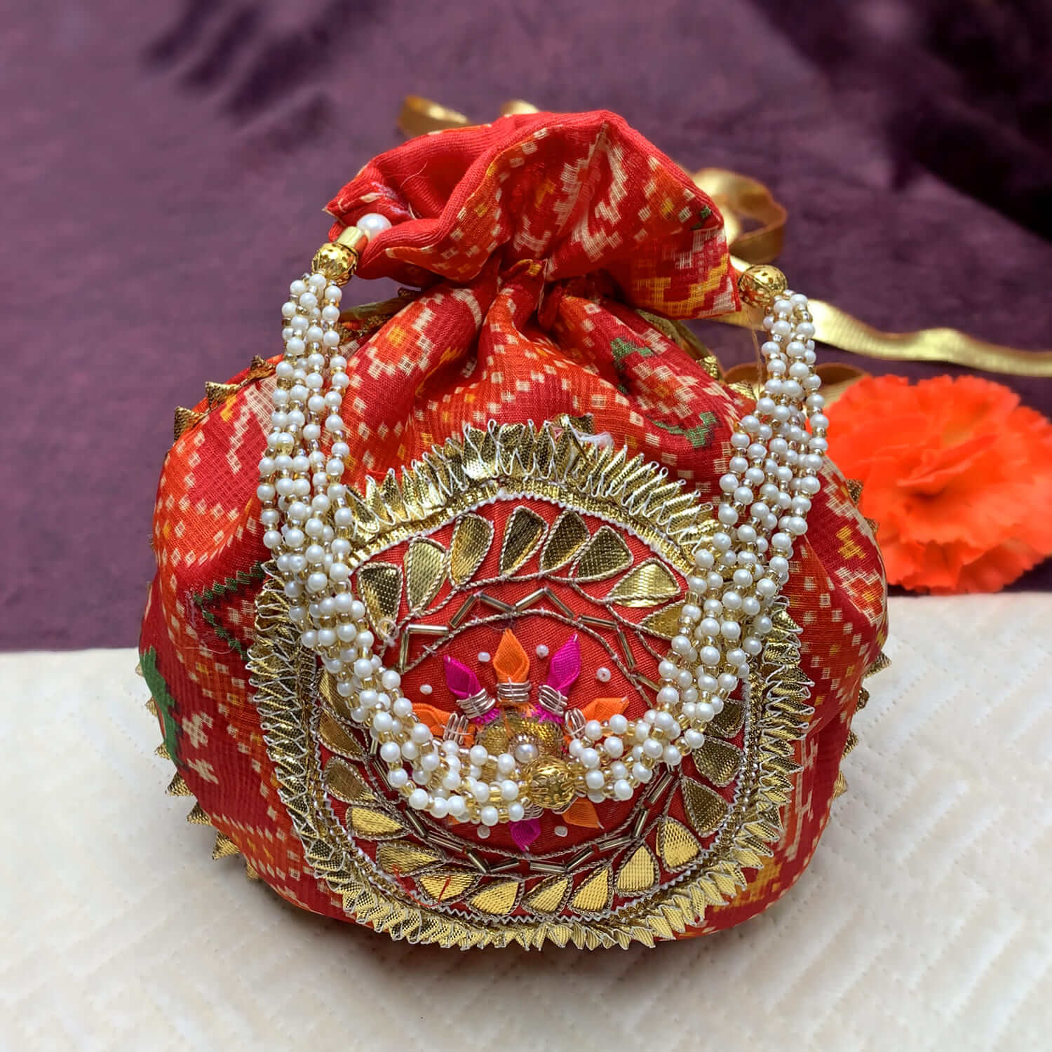 • Material: Made from High quality Fabric with Bandhani  All over the Pouch, Perfectly Stitched Wedding Pouch.
