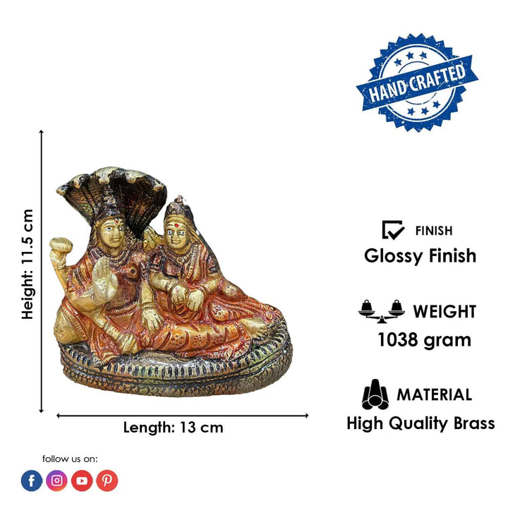 About Product: The 4.5 Inch Brass Vishnu Lakshmi Idol is an elegantly crafted statue representing the divine union of Lord Vishnu and Goddess Lakshmi. Made from high-quality brass, this idol features intricate detailing and a polished golden finish, enhancing its beauty and spiritual significance. Lord Vishnu, the preserver of the universe, is depicted with his symbolic attributes, while Goddess Lakshmi, the goddess of wealth and prosperity, is shown with a serene and graceful expression. Together, they embody harmony, abundance, and divine protection. This 4.5-inch idol is perfect for home or temple decor, bringing a sense of peace, prosperity, and positive energy to any space.