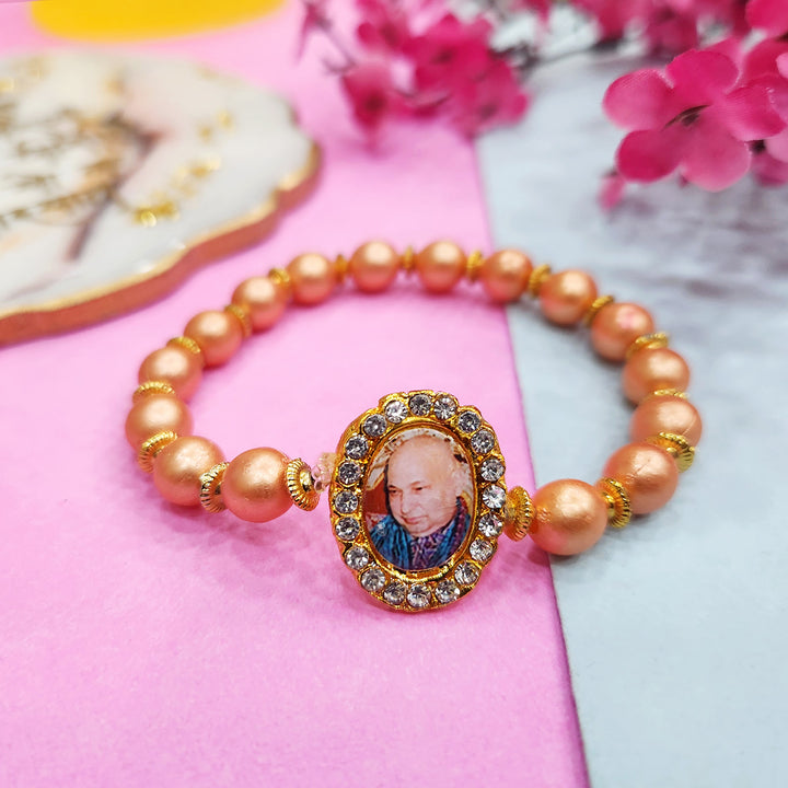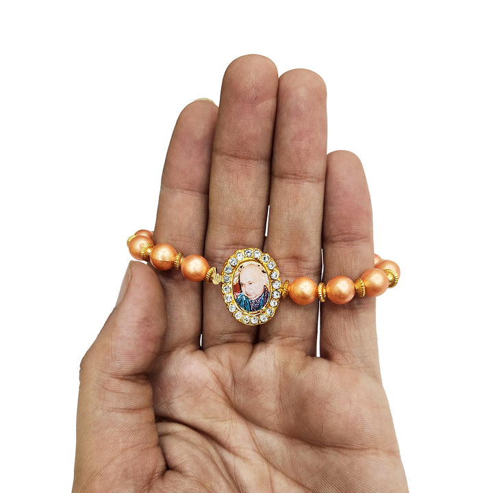 • Item Name: Orange Round Pearl Bracelet with Jai Guruji Swaroop Handmade Bracelets for Men and Women