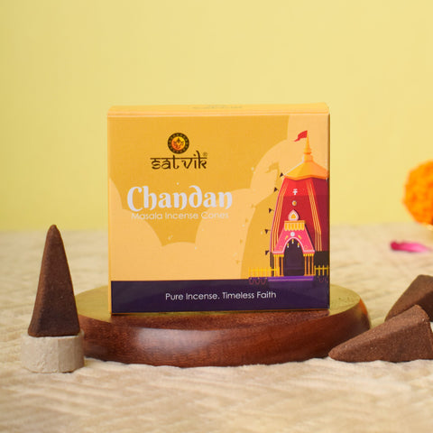 - Chandan Incense Cone: Unveil the calming aroma of pure sandalwood with our Chandan Incense Cone. These cones release a rich and woody scent, ideal for creating a peaceful and meditative environment during your spiritual practices.
