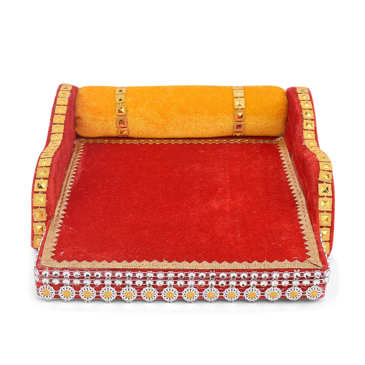 laddu gopal velvet bed | medium krishna sleeping bed | pooja bed for laddu gopal | red velvet deity bed | traditional kanha ji bed | gopal ji velvet bedding | medium size bal gopal bed | mdf velvet deity seat | divine krishna pooja accessories | soft velvet laddu gopal throne | spiritual krishna bed | handmade deity furniture