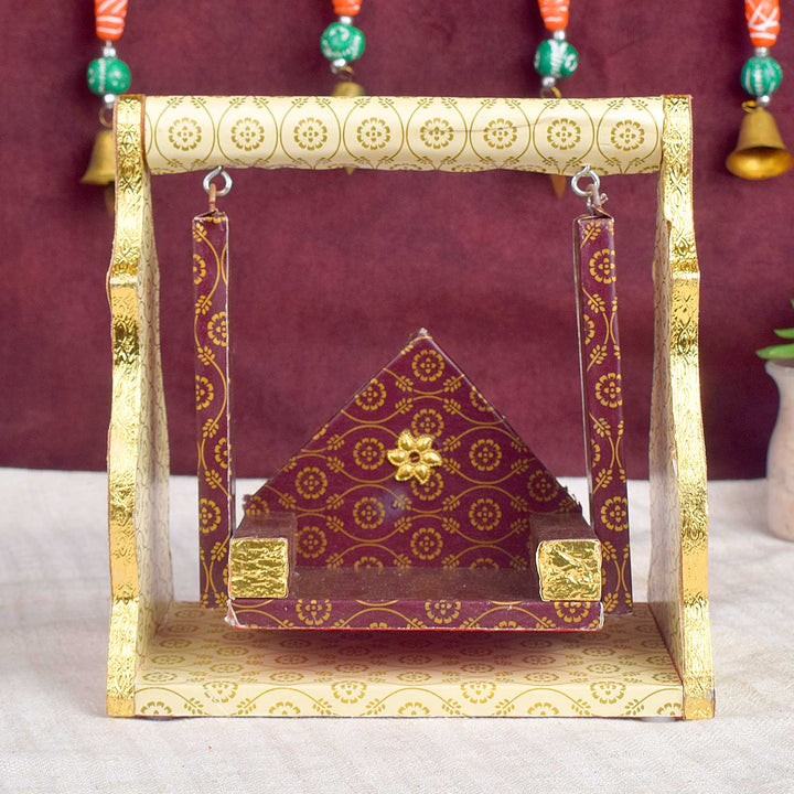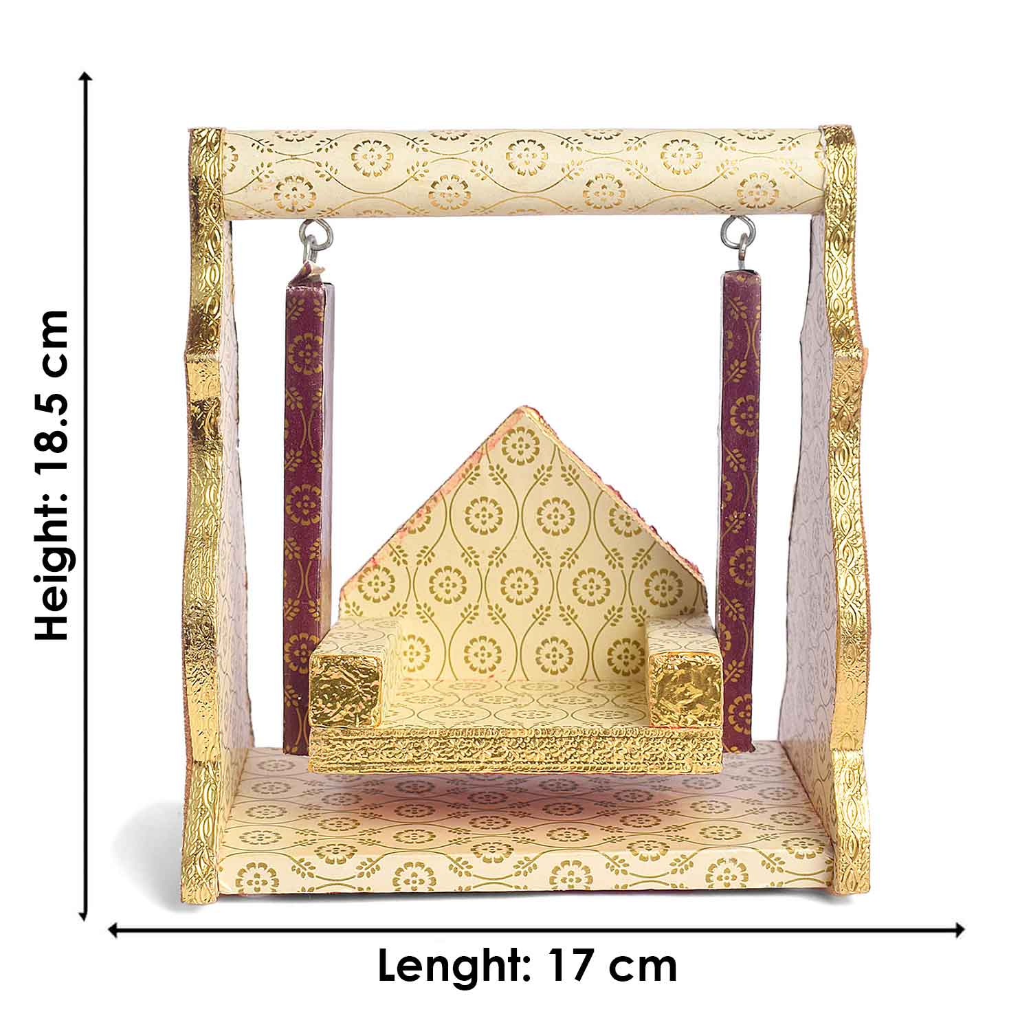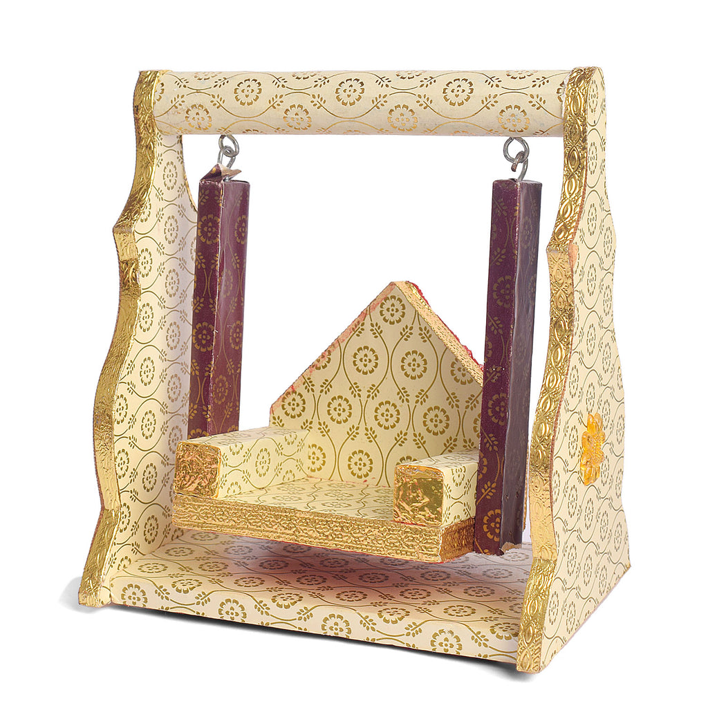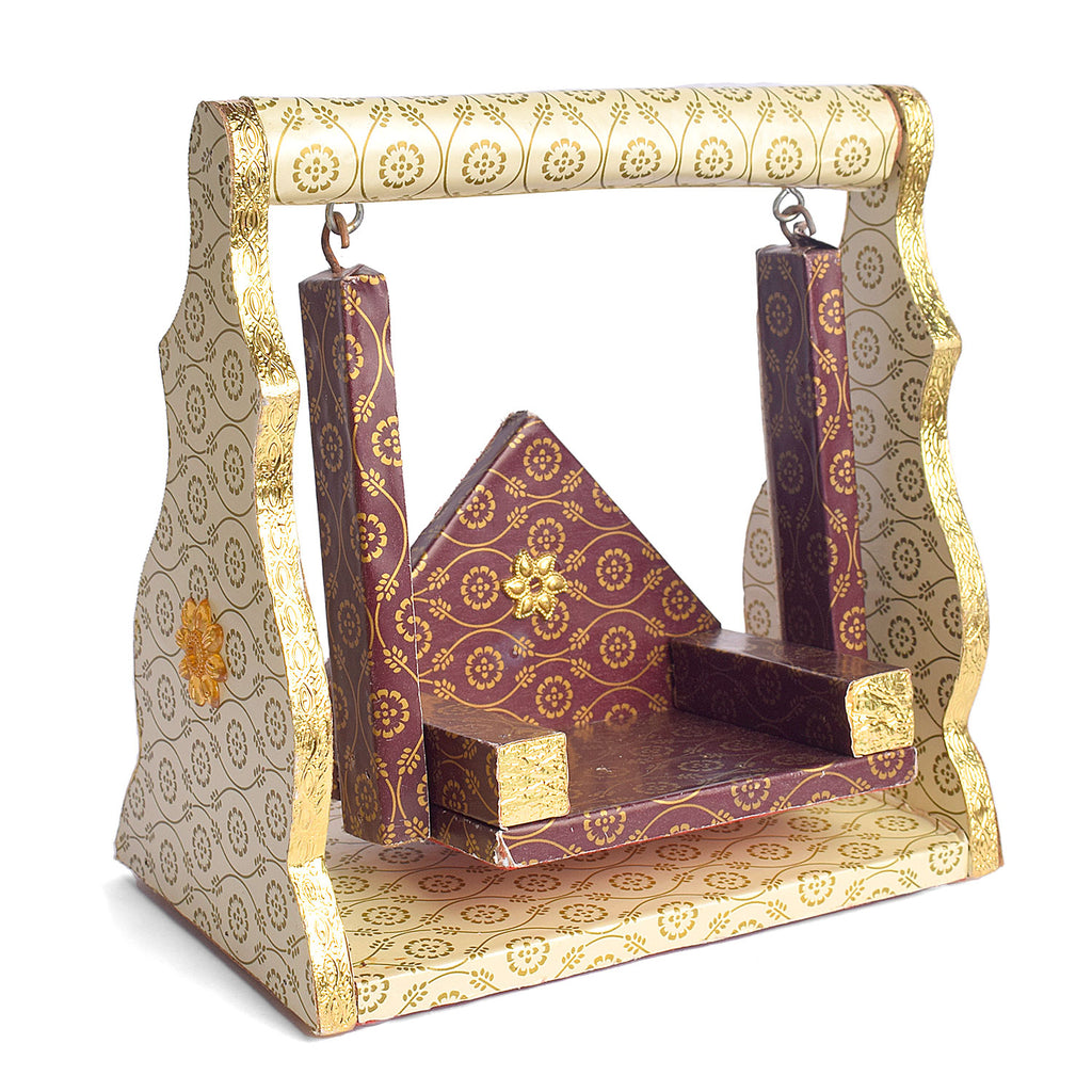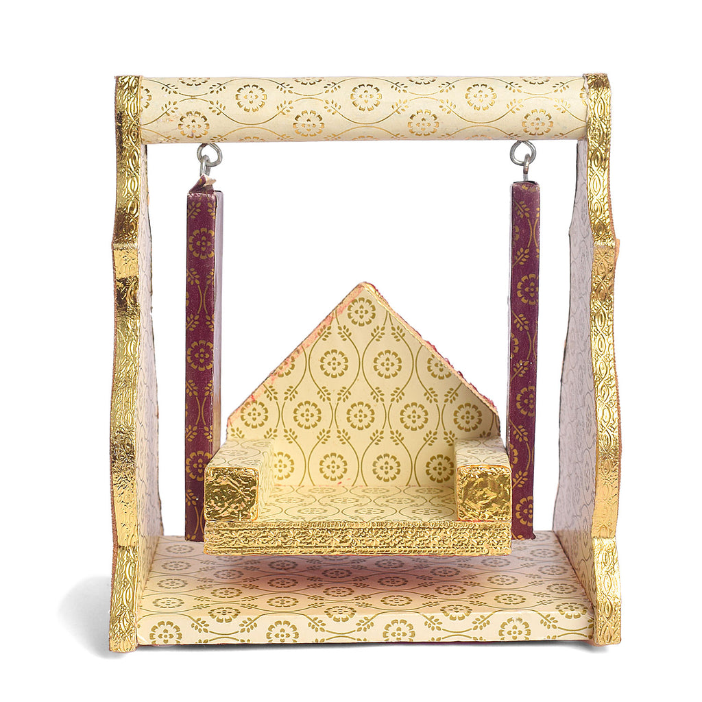 Presenting a divine blend of subtle tradition and elegant design—this Printed Design Jhula features a classic white and gold paper-covered frame paired with a cradle wrapped in rich brown printed paper. The beautiful contrast adds depth and warmth, making it a unique piece for your pooja space.