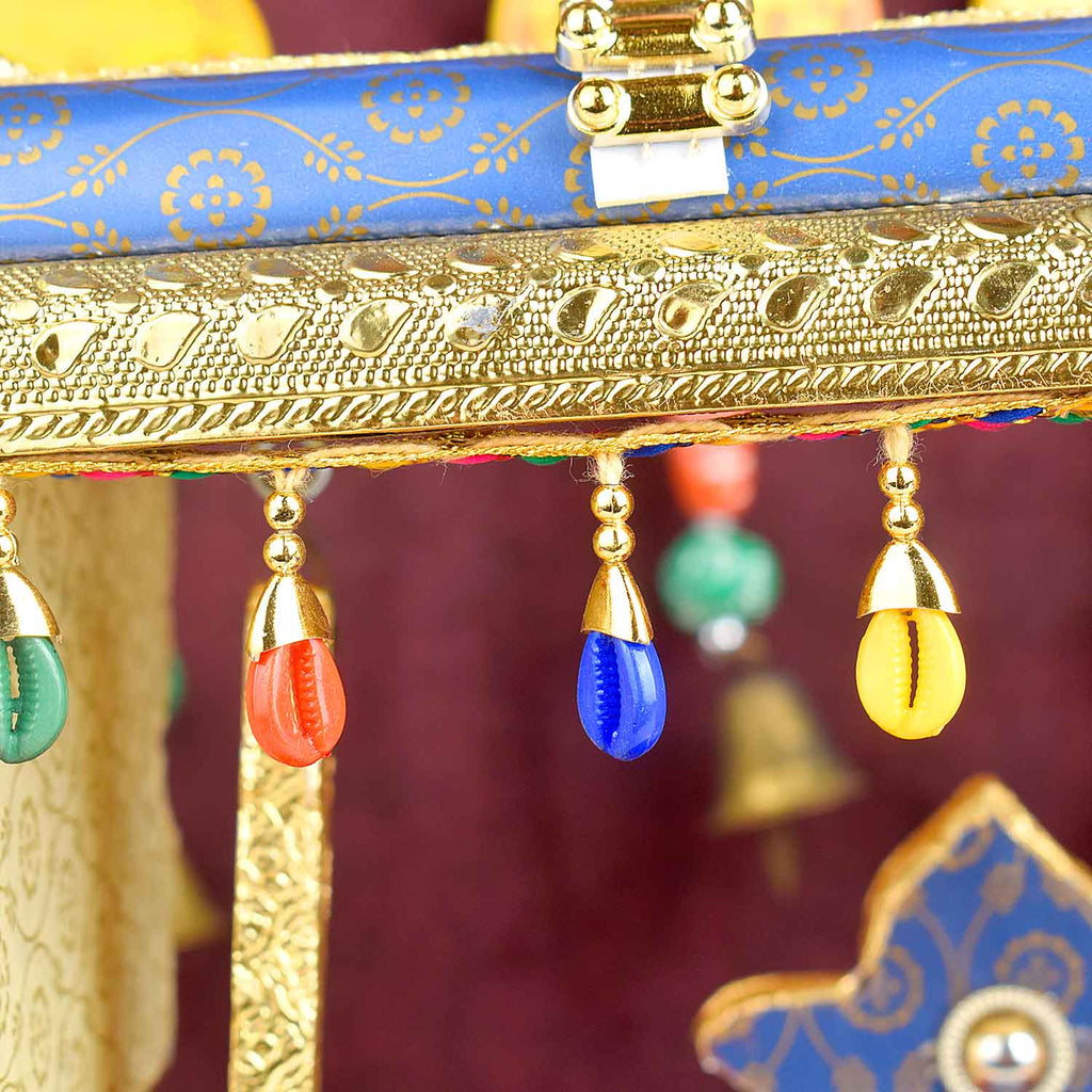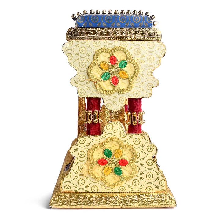 Grace your mandir with this stunning Royal Blue Wooden & Metal Singhasan Jhula for Laddu Gopal. Designed to blend tradition with elegance, the jhula features a richly detailed singhasan-style seat in royal blue, resting on a broad dome-inspired structure crafted from shining gold-toned metal and sturdy wood.