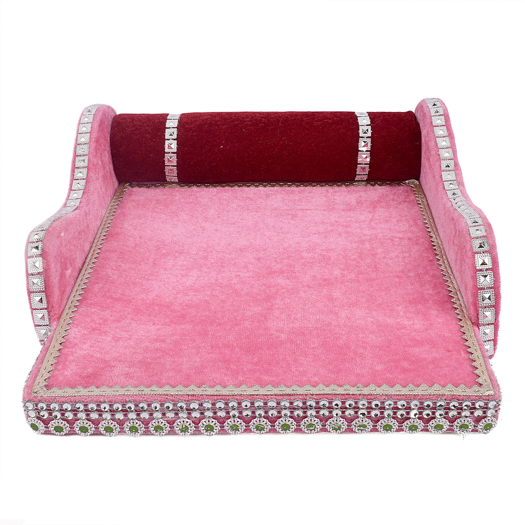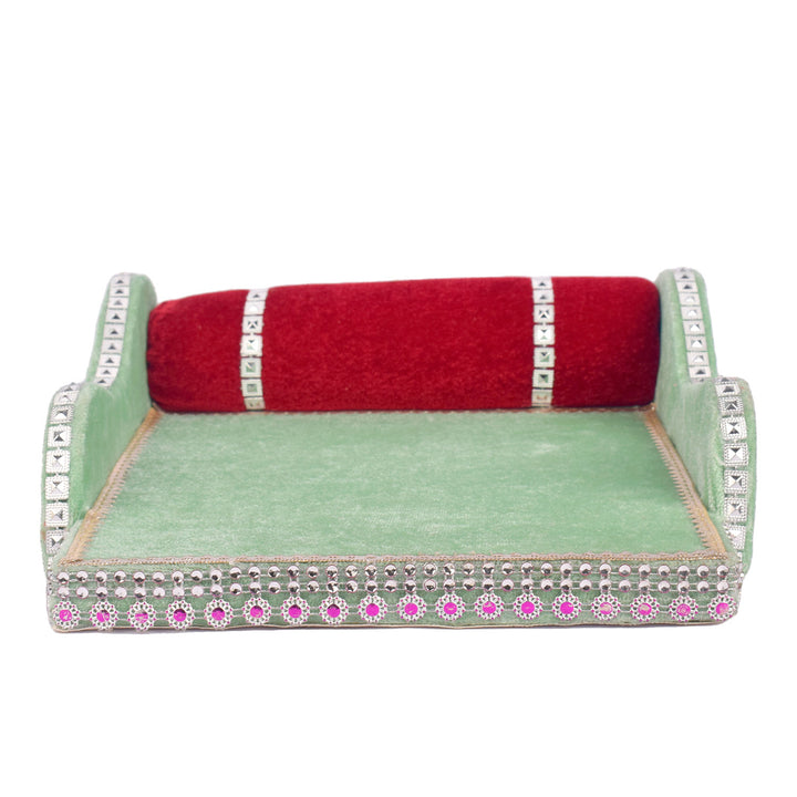 laddu gopal velvet bed | pooja bed for laddu gopal | green velvet krishna bed | pink bal gopal bed | large laddu gopal sleeping bed | devotional krishna furniture | handmade pooja accessories | velvet sleeping seat for deity | kanha ji luxury bedding | krishna temple bed