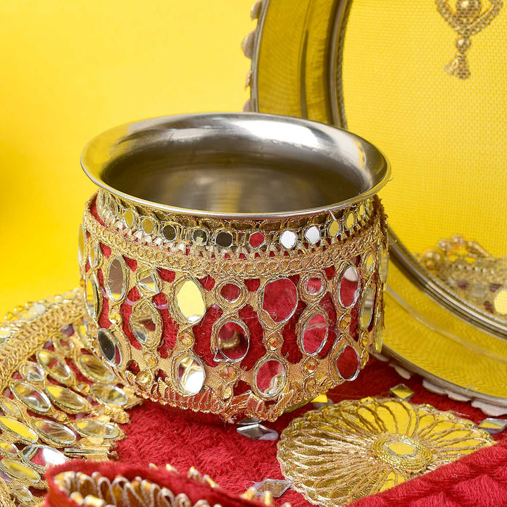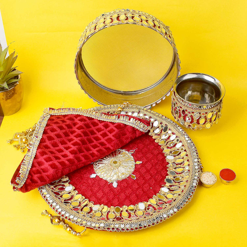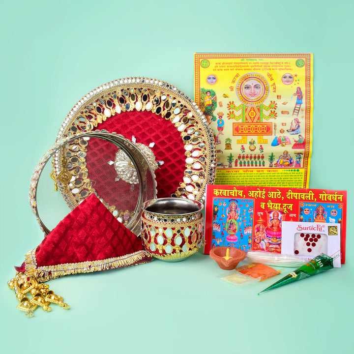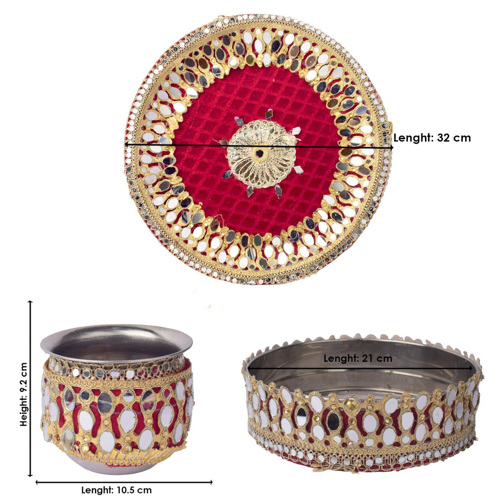 Shop Maroon Mirror Work Karwa Chauth Thali Set 11 Pc | Satvikstore.in – satvikstore.in