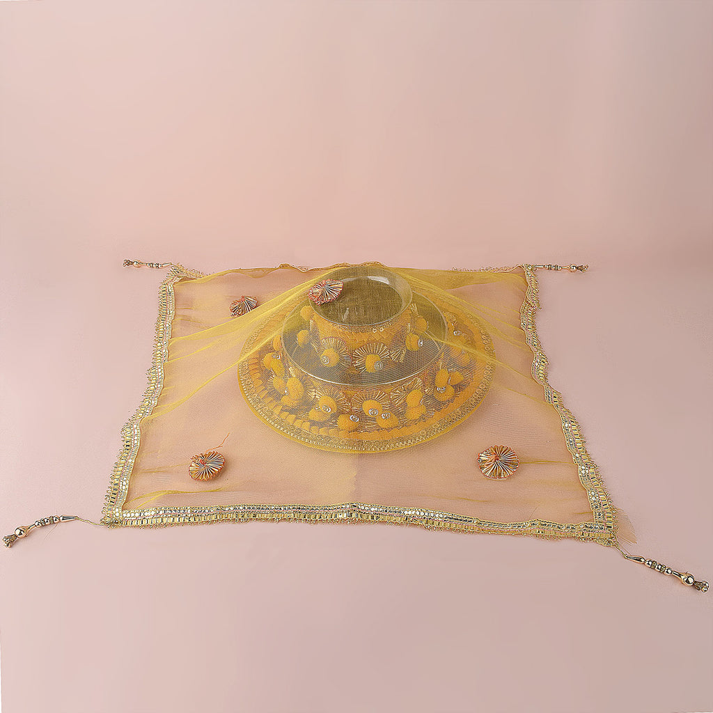 Item Name: 11 Pc Yellow Pompom Karwa Chauth Thali Set with Cover