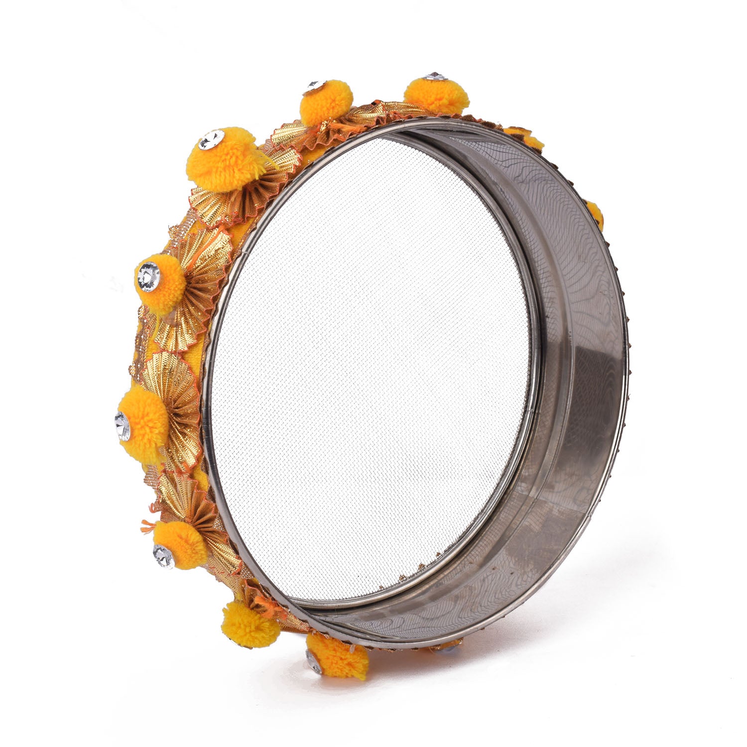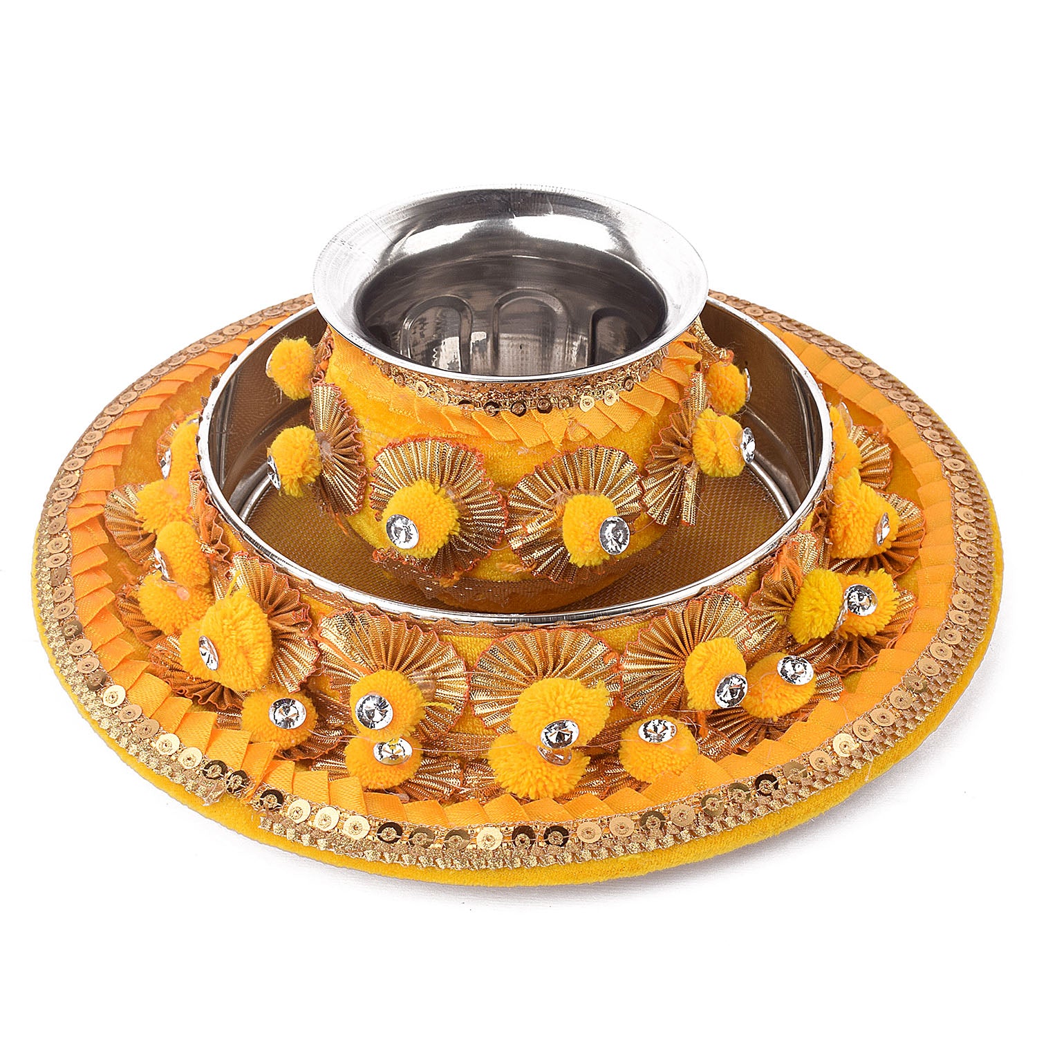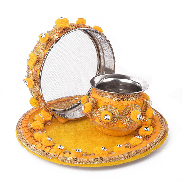 11 Pc Yellow Pompom Karwa Chauth Karva Chauth Thali Set with Cover – satvikstore.in