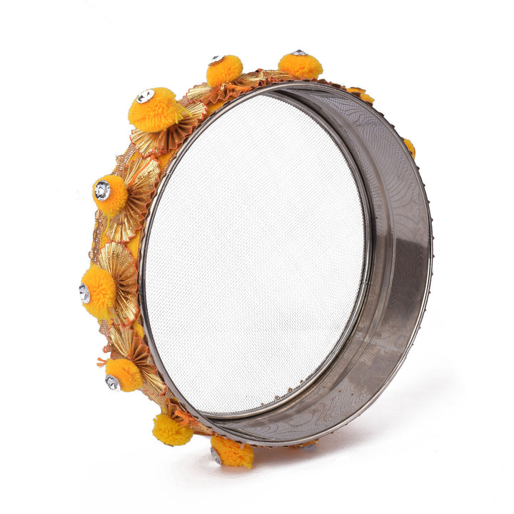 11 Pc Yellow Pompom Karwa Chauth Karva Chauth Thali Set with Cover