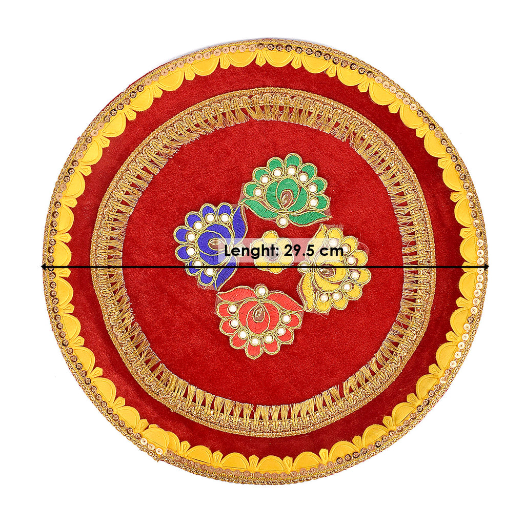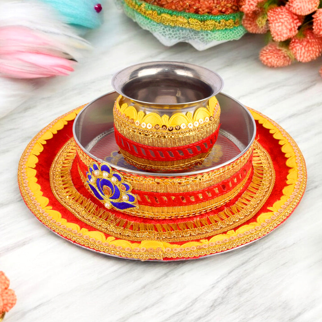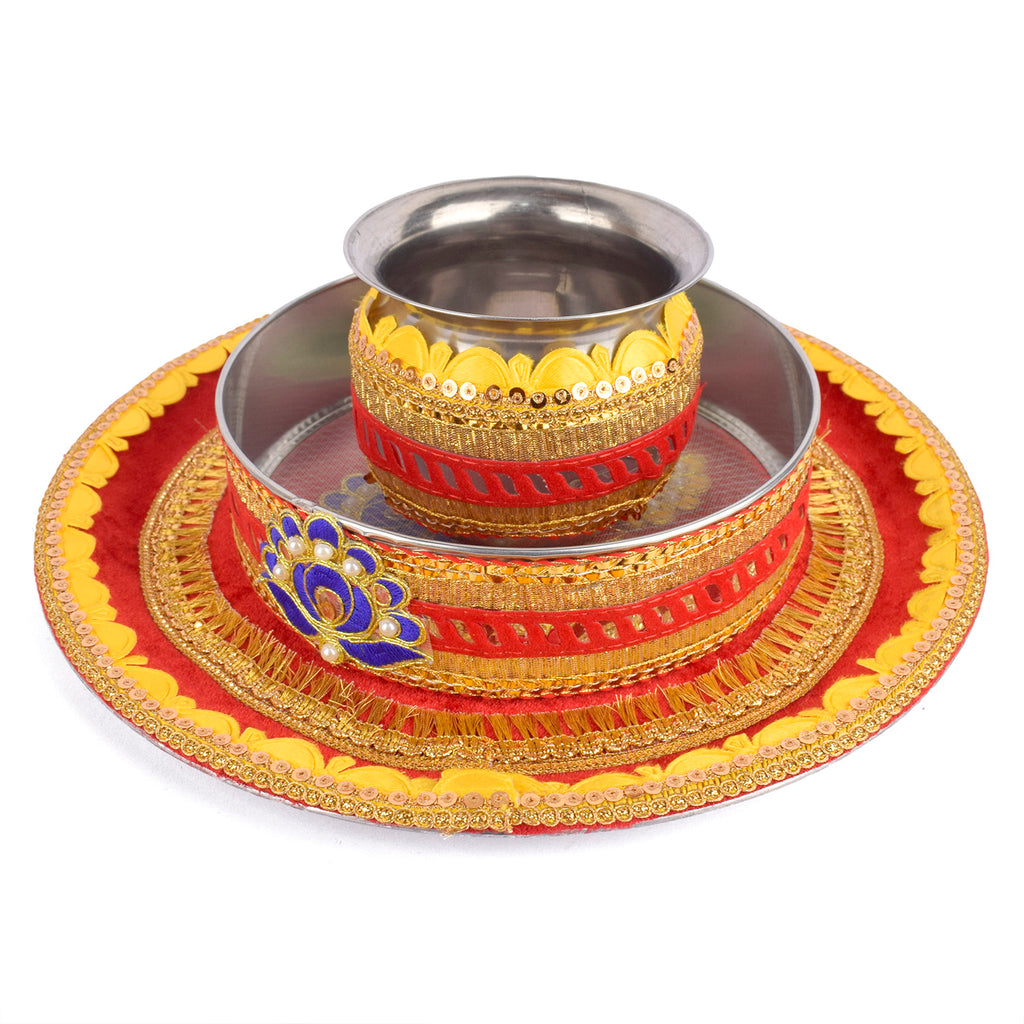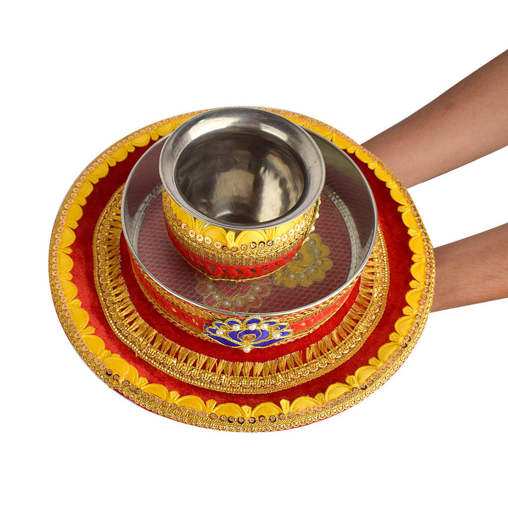 Elegant Red Gota Patti Karwa Chauth Thali Set - 3pc | Shop at SatvikStore.in – satvikstore.in