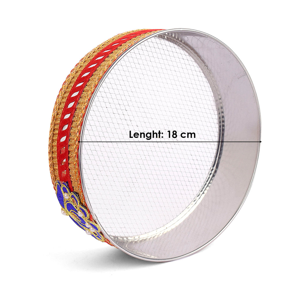 Design: Beautiful Handcrafted Designer Karwa Thali with Fabric all over the Thali and Lace Work all over the Lota and Sieve (Channi), Which makes it more Attractive.