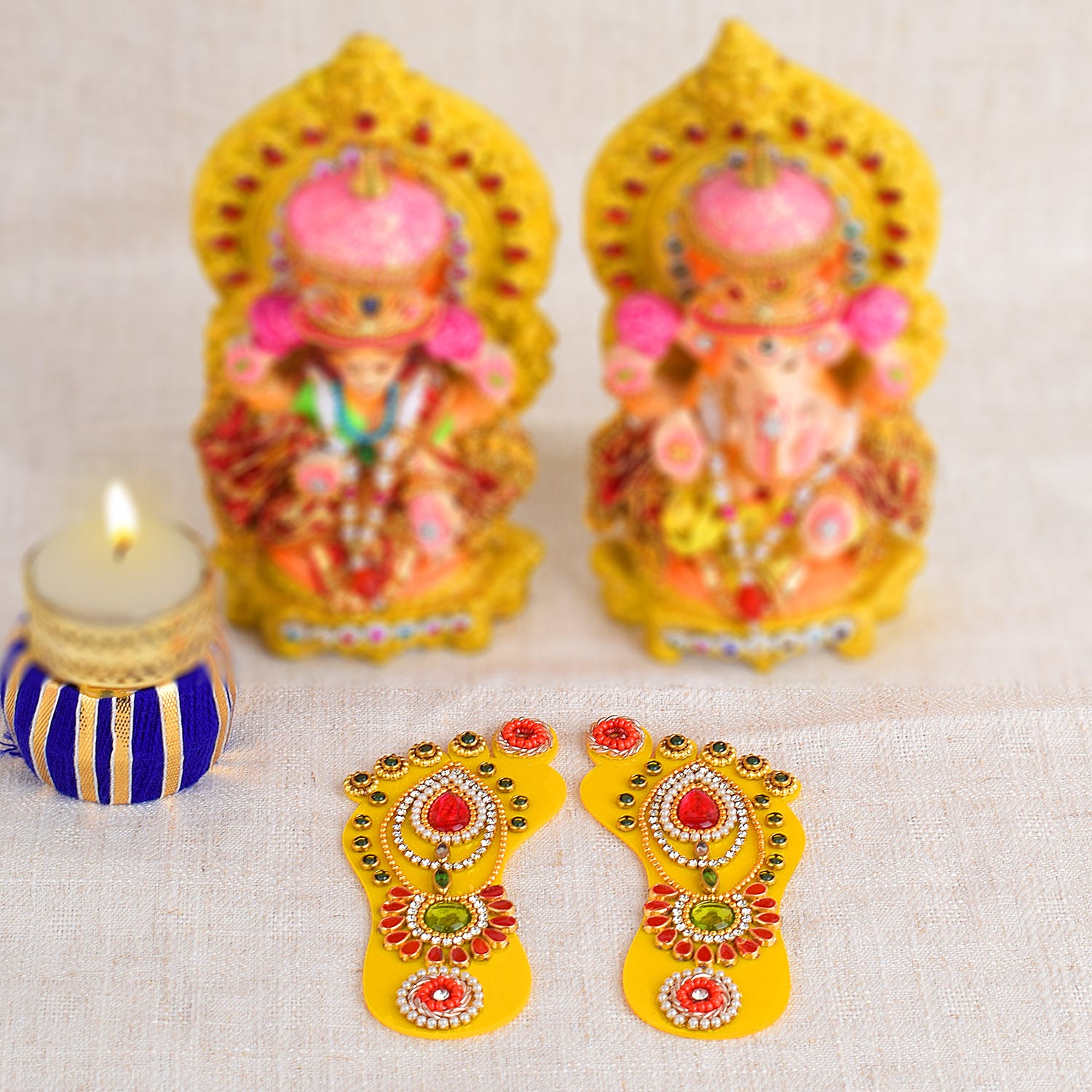 For those who appreciate the simplicity of tealights and candles, SatvikStore.in offers an array of options, each exuding a unique charm. Decorating your home becomes a spiritual journey with Laxmi Charan and Swastik stickers, ensuring that auspiciousness permeates every corner.