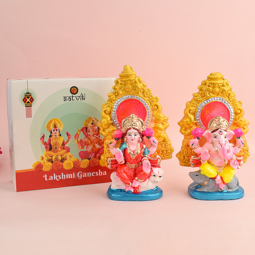 • Product Details: Material: Clay Dimensions: Ganesha: Height: 17cm, Length: 10.5cm, Width: 5.7cm, Laxmi: Height: 18cm, Length: 10.5cm, Width: 5.7cm, Total weight: 557gram, Finish Type: Glossy.
