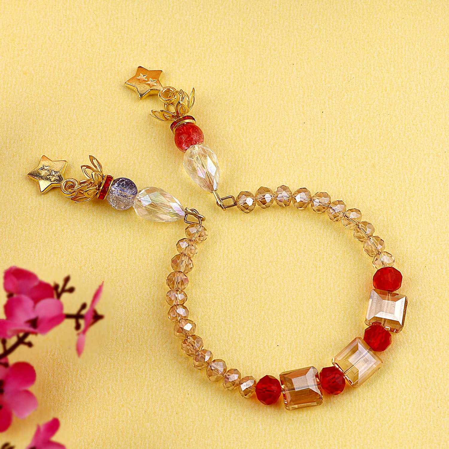Beaded Bhaiya Rakhi Set of 2: Bedecked with colorful beads, these rakhis represent the joyous moments and cherished memories of growing up together. Embrace nostalgia and affection with this delightful beaded rakhi set.