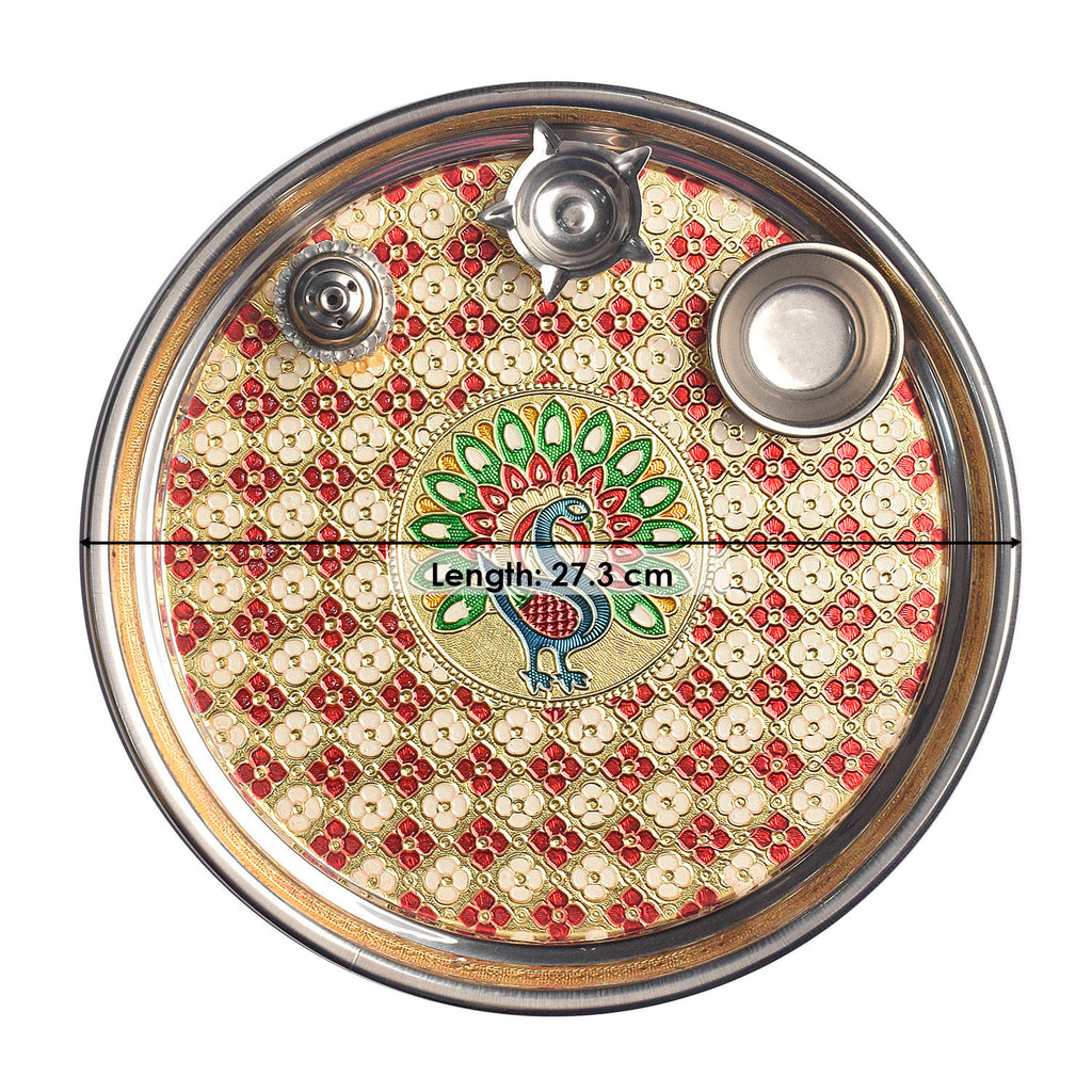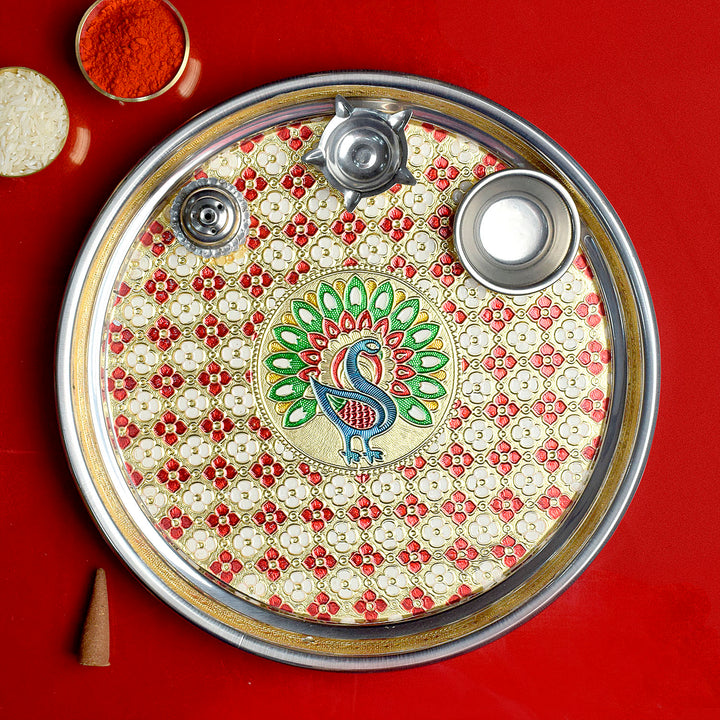 • Intricate Peacock Design: Adorned with an intricate peacock motif, the thali captures the regal charm and grace associated with this majestic bird. The detailed craftsmanship adds a touch of sophistication to your puja rituals.