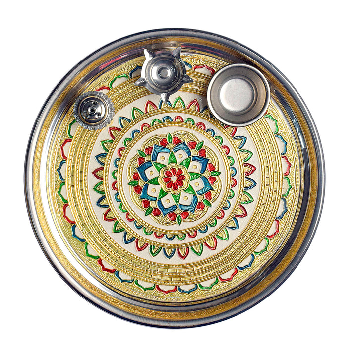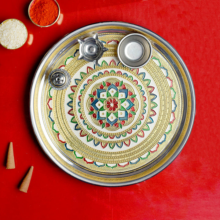 Buy Our Elegant Steel Printed Pooja Aarti Thali Set | Satvikstore.in – satvikstore.in
