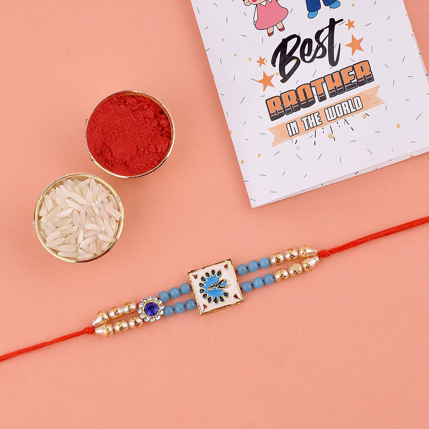 • Package:Β 1 Pc Rakhi, roli akshat and greeting card
