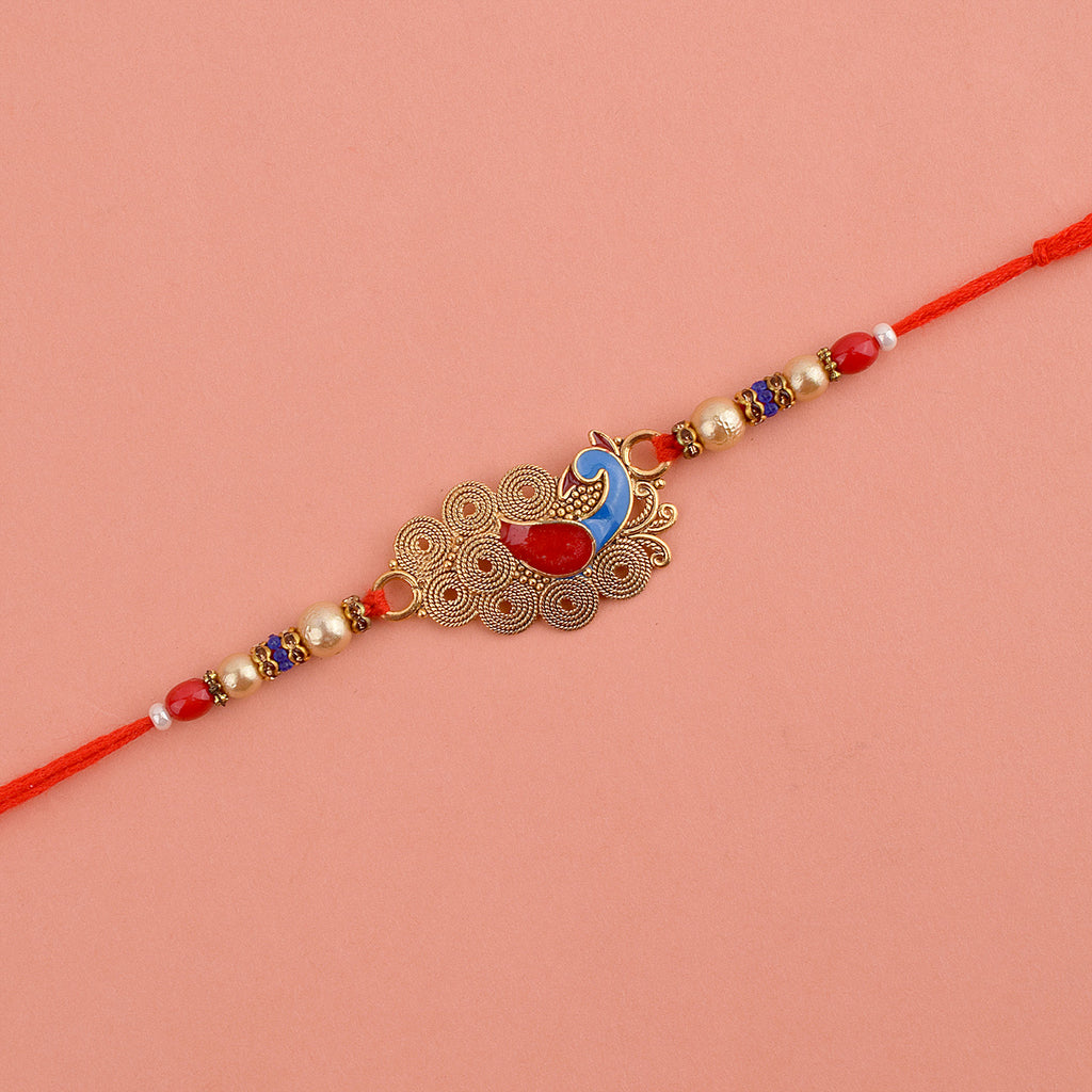 Beaded Rakhi: Adorned with intricate beads, our beaded rakhi collection exudes charm and elegance. Celebrate the joyous bond with your siblings as you tie these vibrant and delightful rakhis on their wrists.