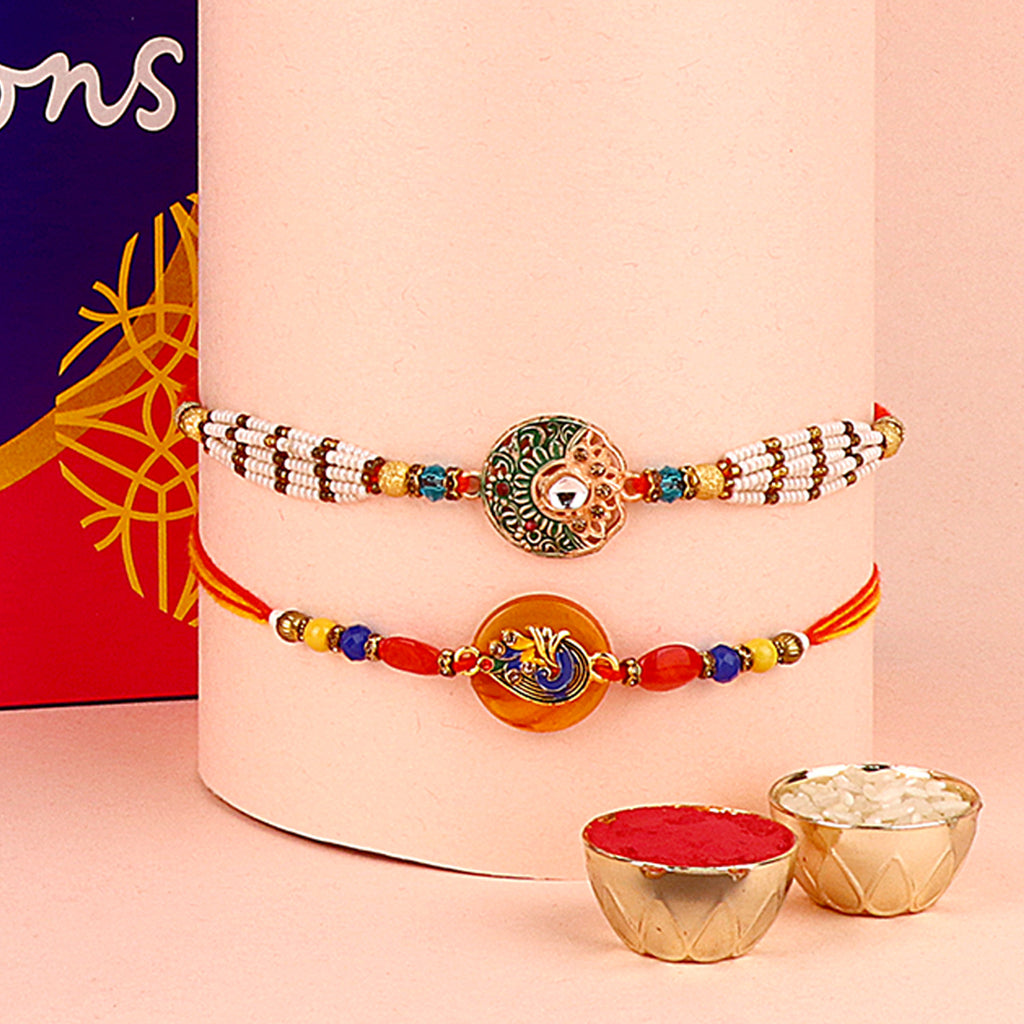 Beaded Bhaiya Rakhi Set of 2: Bedecked with colorful beads, these rakhis represent the joyous moments and cherished memories of growing up together. Embrace nostalgia and affection with this delightful beaded rakhi set.
