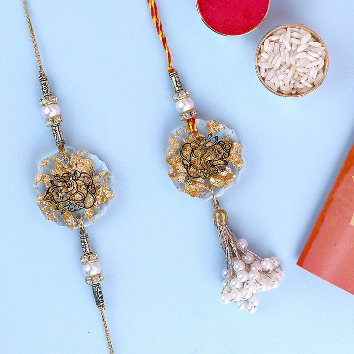 Beaded Bhaiya Rakhi Set of 2: Bedecked with colorful beads, these rakhis represent the joyous moments and cherished memories of growing up together. Embrace nostalgia and affection with this delightful beaded rakhi set.