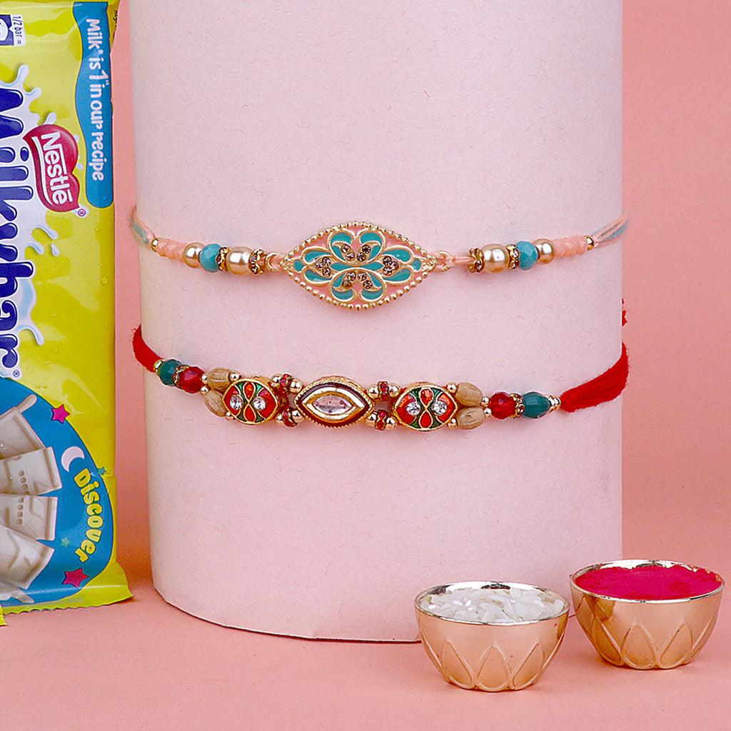 Meenakari Rakhi Set of 2: Adorned with intricate Meenakari work, these rakhis exude the essence of cultural heritage and artistic finesse. The vibrant colors and delicate patterns make these rakhis a true celebration of sibling love.