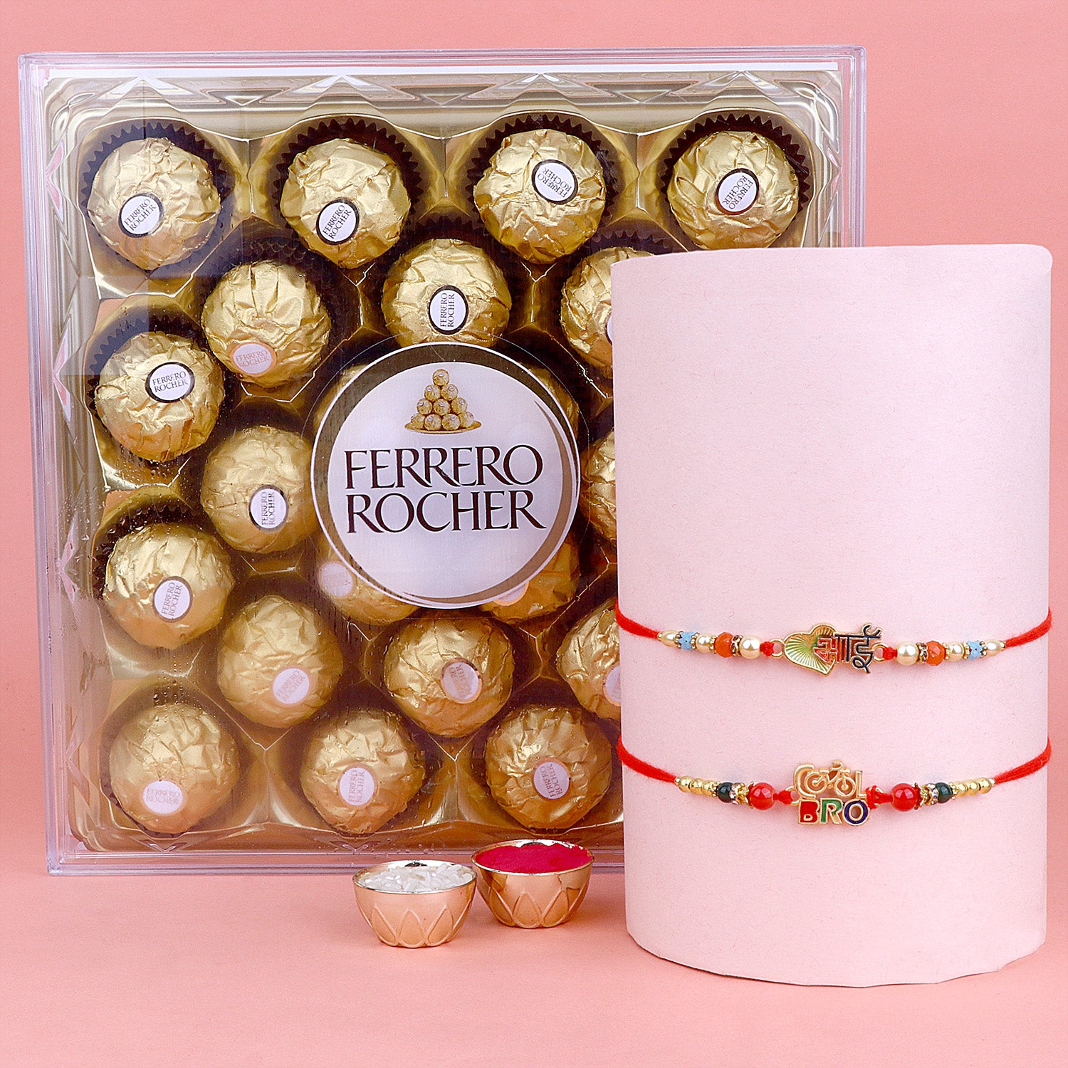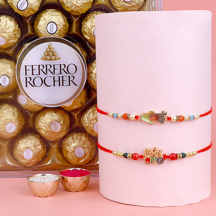 • Package: Set of 2 Bhaiya Rakhi, 1 Greeting card, 1 Roli Chawal Bottle, 1Β Chocolate Pack