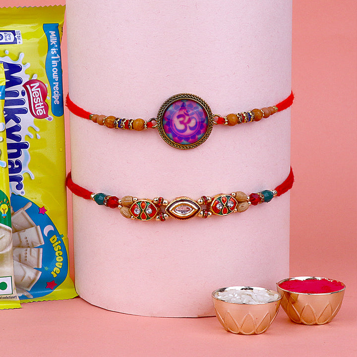 Meenakari Rakhi Set of 2: Adorned with intricate Meenakari work, these rakhis exude the essence of cultural heritage and artistic finesse. The vibrant colors and delicate patterns make these rakhis a true celebration of sibling love.