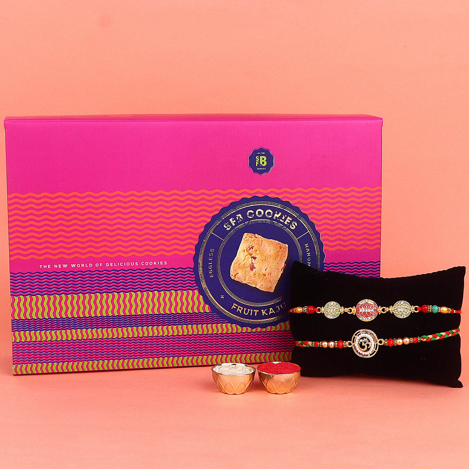• About Product: Celebrate the joyous occasion of Rakhi with our delightful Rakhi with Cookies gift set. This perfect combination features a beautifully crafted Rakhi symbolizing the bond between siblings, paired with a selection of scrumptious cookies that will leave your taste buds craving for more. Indulge in the mouthwatering flavors and textures of these delectable treats, perfectly complementing the heartfelt sentiments shared between brothers and sisters. Whether you're near or far, our Rakhi with Cookies gift set is a sweet and thoughtful way to express your love and strengthen the cherished bond you share. Make this Raksha Bandhan truly memorable with this irresistible combination.