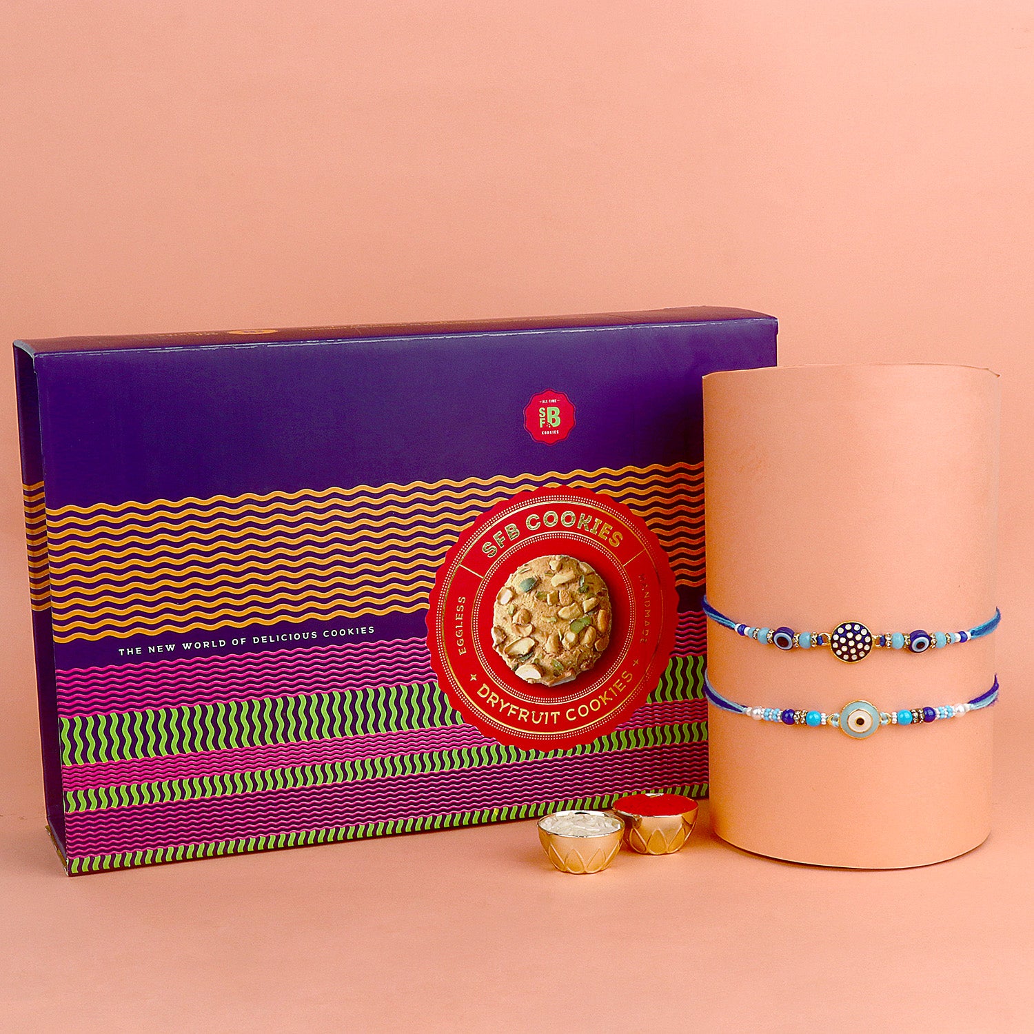 • About Product: Celebrate the joyous occasion of Rakhi with our delightful Rakhi with Cookies gift set. This perfect combination features a beautifully crafted Rakhi symbolizing the bond between siblings, paired with a selection of scrumptious cookies that will leave your taste buds craving for more. Indulge in the mouthwatering flavors and textures of these delectable treats, perfectly complementing the heartfelt sentiments shared between brothers and sisters. Whether you're near or far, our Rakhi with Cookies gift set is a sweet and thoughtful way to express your love and strengthen the cherished bond you share. Make this Raksha Bandhan truly memorable with this irresistible combination.