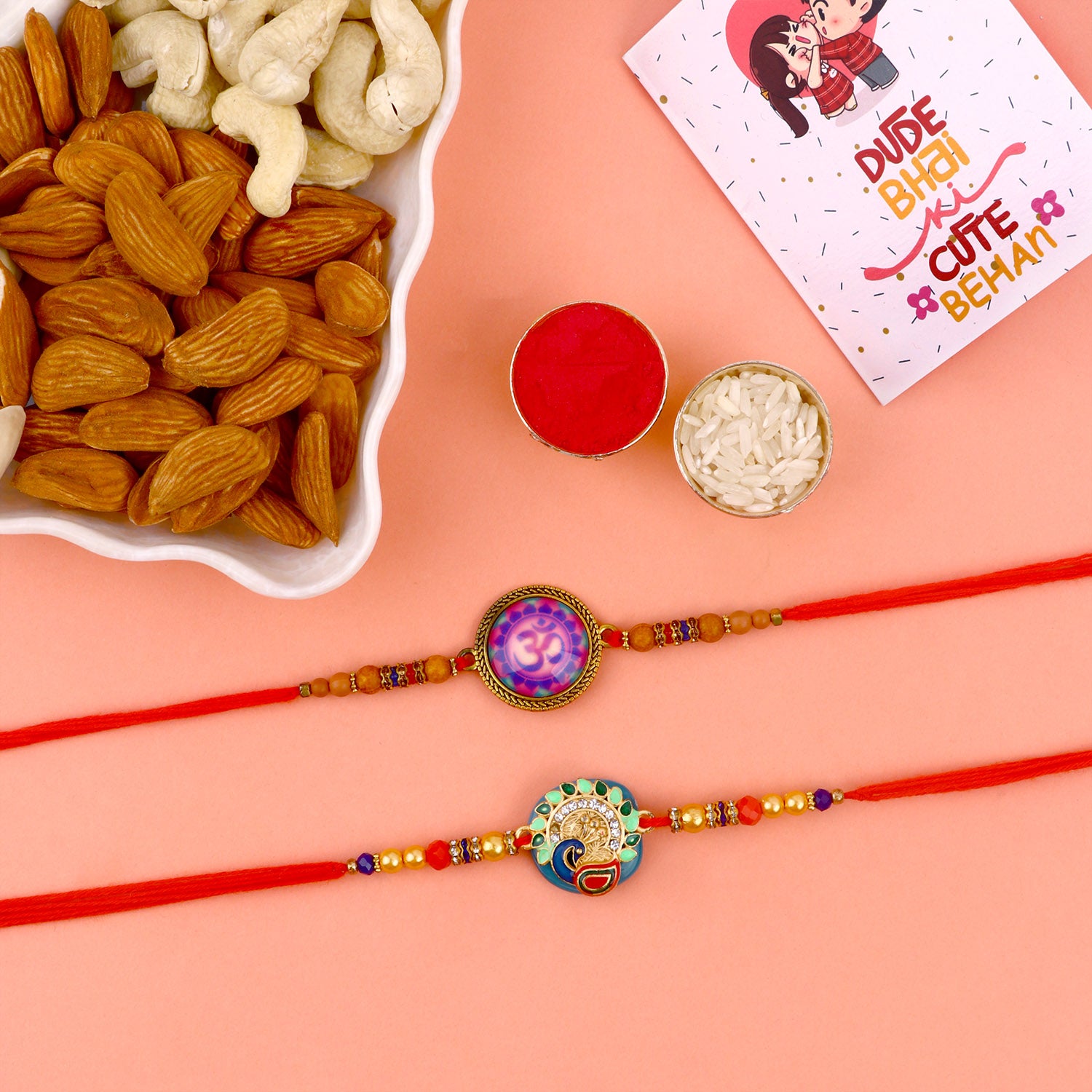 Meenakari Rakhi Set of 2: Adorned with intricate Meenakari work, these rakhis exude the essence of cultural heritage and artistic finesse. The vibrant colors and delicate patterns make these rakhis a true celebration of sibling love.