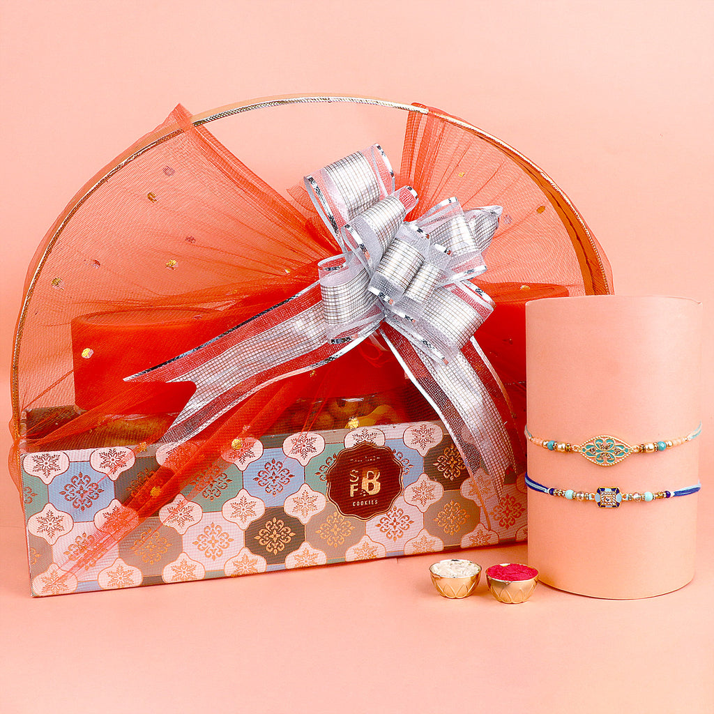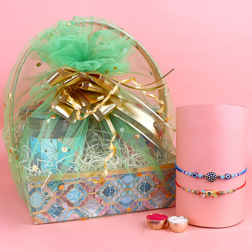 Accompanying the Rakhi is a thoughtfully curated gift hamper, designed to delight your dear Bhaiya with a selection of his favorite treats, chocolates, or thoughtful keepsakes. The hamper is carefully packed, ensuring that every element is of the finest quality and chosen with love, making it a truly heartwarming gift.