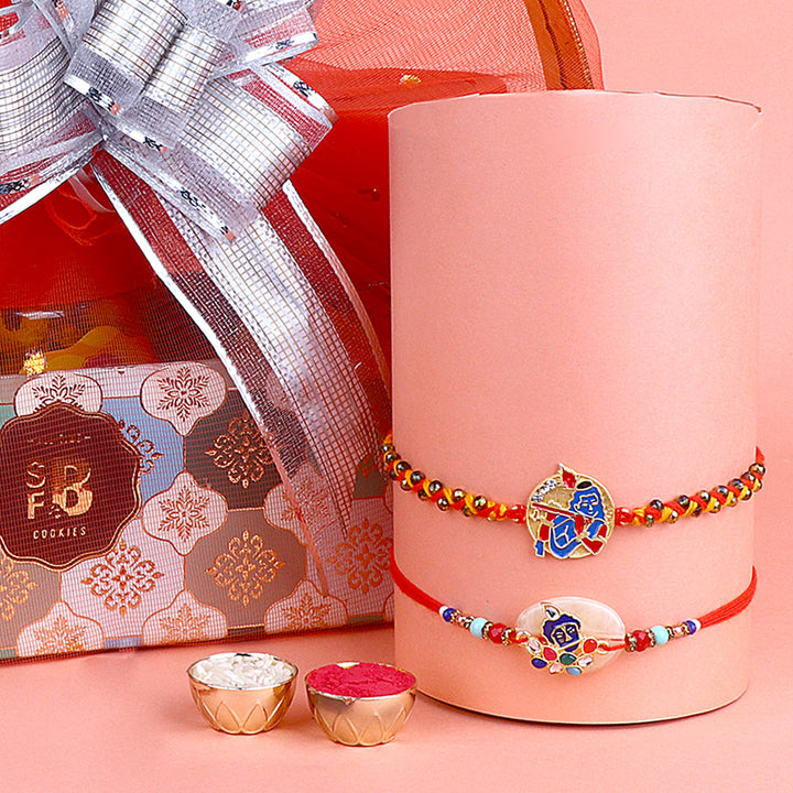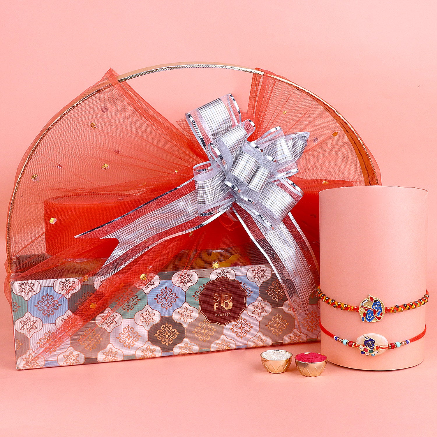 Accompanying the Rakhi is a thoughtfully curated gift hamper, designed to delight your dear Bhaiya with a selection of his favorite treats, chocolates, or thoughtful keepsakes. The hamper is carefully packed, ensuring that every element is of the finest quality and chosen with love, making it a truly heartwarming gift.