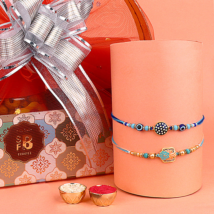 Our Bhaiya Rakhi with Gift Hamper is a delightful combination that includes a beautifully handcrafted Rakhi, lovingly designed to symbolize the bond between siblings, along with an assorted gift hamper packed with goodies and tokens of affection. This exclusive Rakhi hamper is a perfect way to shower your brother with love and blessings on this auspicious day.