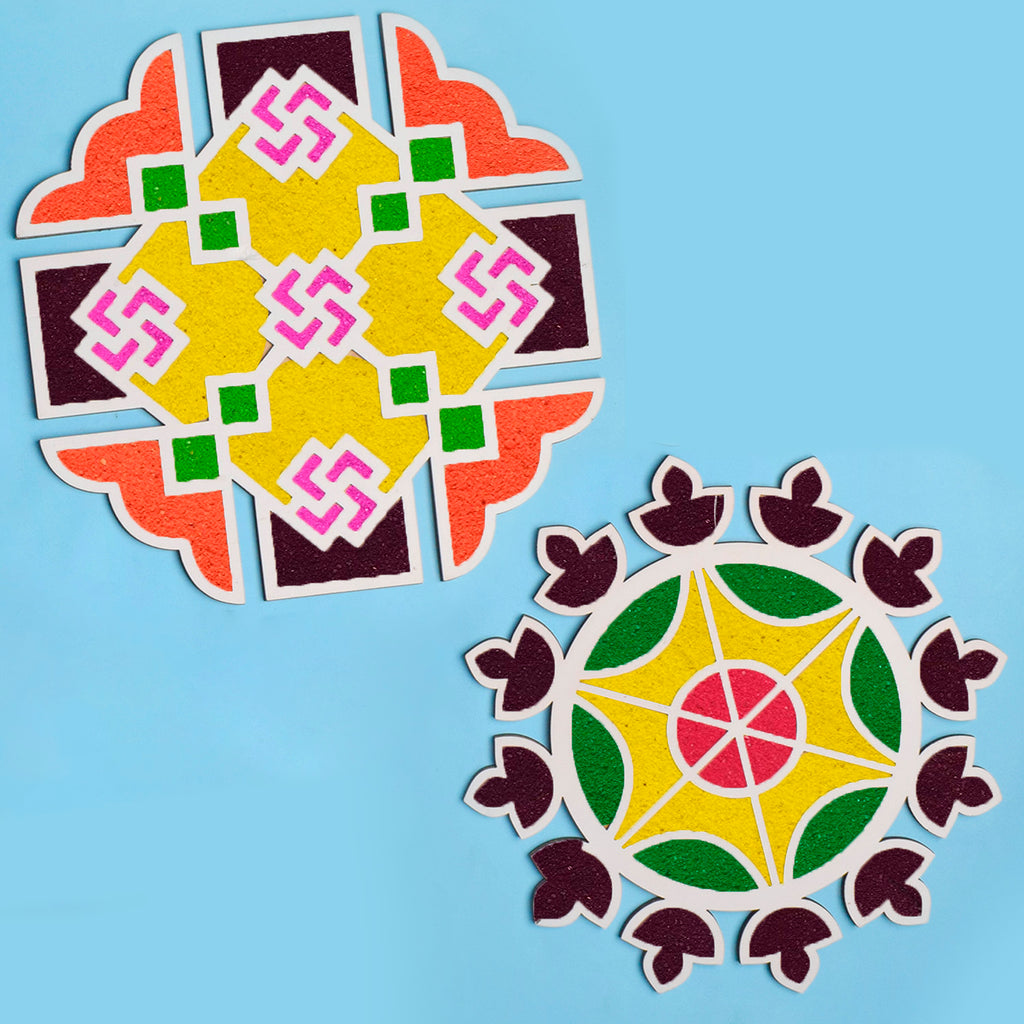 • Package Contain: Set of 2 Different Design Portable Rangoli Stencil with 5 rangoli pouches.