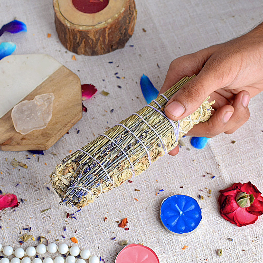 • About Product: We at Satvikstore. immerse yourself in the tranquil energy of White Sage combined with Lavenders and Clear Quartz Crystal Healing Smudges. This exquisite smudge bundle creates a serene ambiance, purifying negative energies and promoting clarity. White Sage clears the space, Lavenders infuse a soothing aroma, while Clear Quartz Crystal enhances spiritual healing. Perfect for meditation, energy cleansing, and sacred rituals.