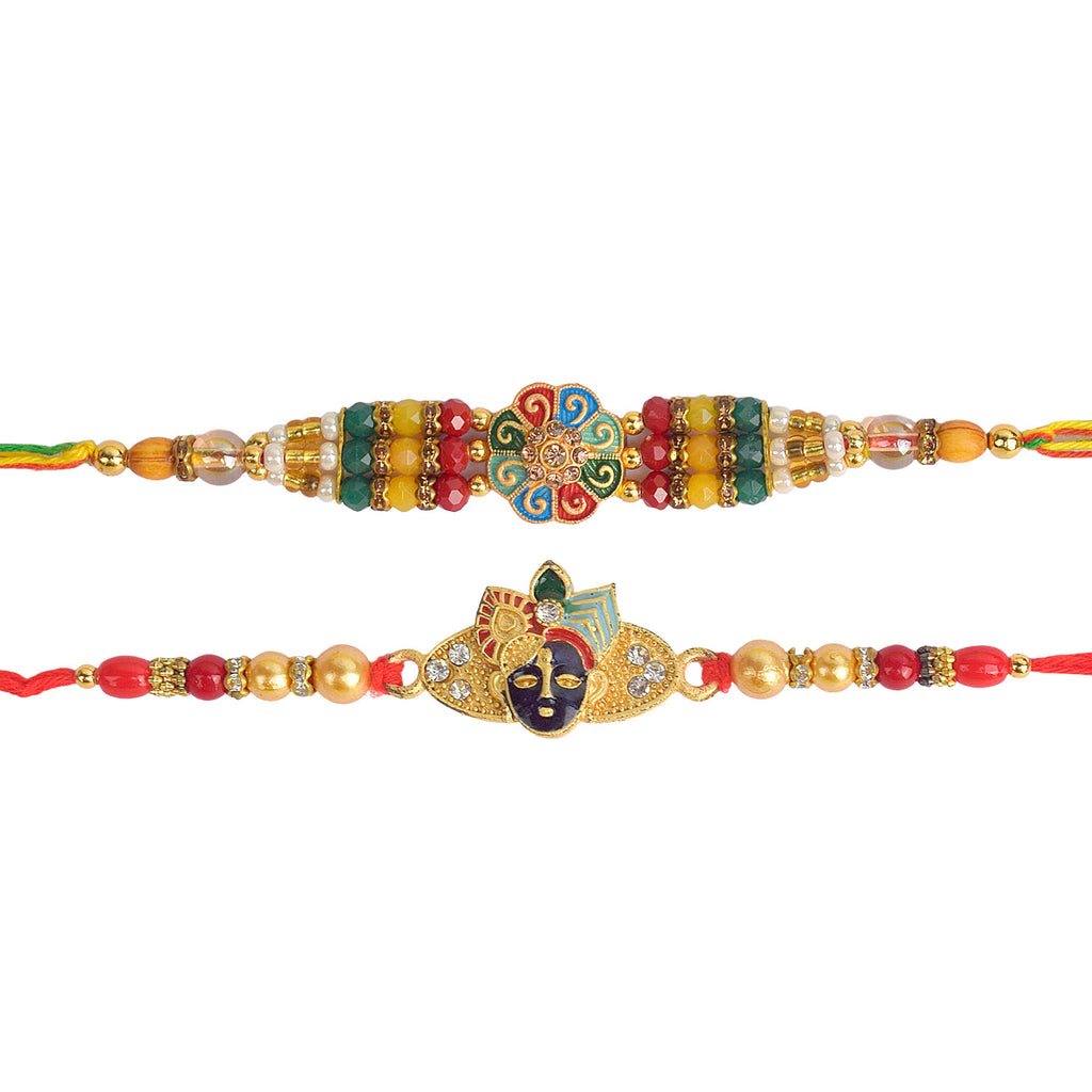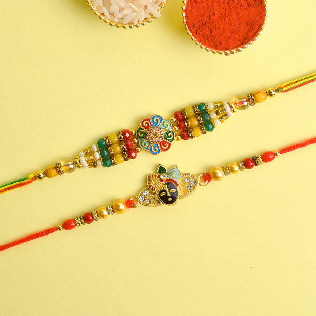 Beaded Bhaiya Rakhi Set of 2: Bedecked with colorful beads, these rakhis represent the joyous moments and cherished memories of growing up together. Embrace nostalgia and affection with this delightful beaded rakhi set.