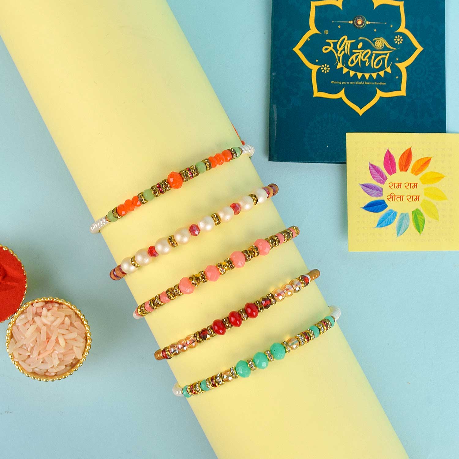 • Item Name: Set of 5 Designer Rakhi with Roli Chawal & Ram Sita Stickers