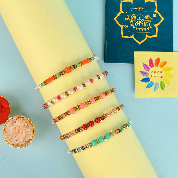 Set of 5 Rakhi | Designer Rakhi Combo | Rakhi Gift Set | Rakhi with Roli Chawal | Buy Rakhi Online | Raksha Bandhan Rakhi Combo | Traditional Rakhi Set | Rakhi for Brother | Rakhi with Blessings Stickers | Family Rakhi Set