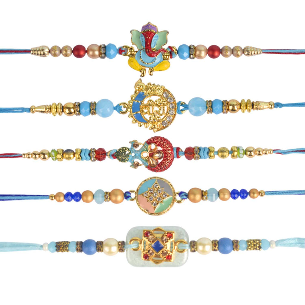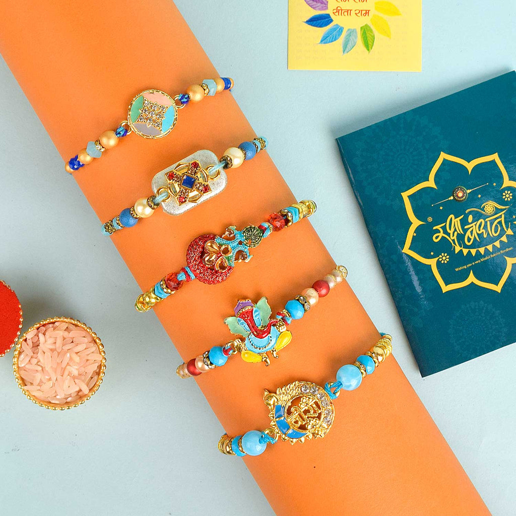Set of 5 Rakhi | Designer Rakhi Combo | Rakhi Gift Set | Rakhi with Roli Chawal | Buy Rakhi Online | Raksha Bandhan Rakhi Combo | Traditional Rakhi Set | Rakhi for Brother | Rakhi with Blessings Stickers | Family Rakhi Set
