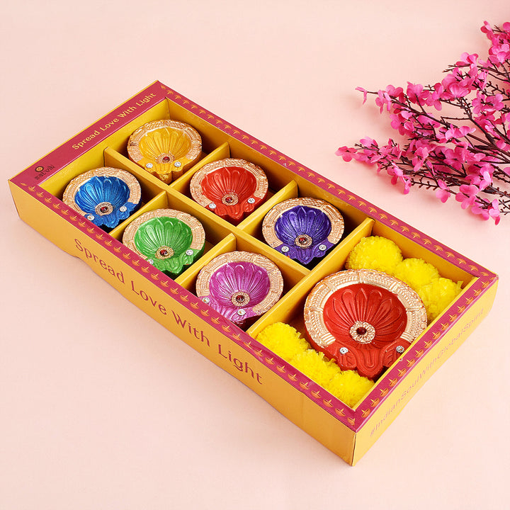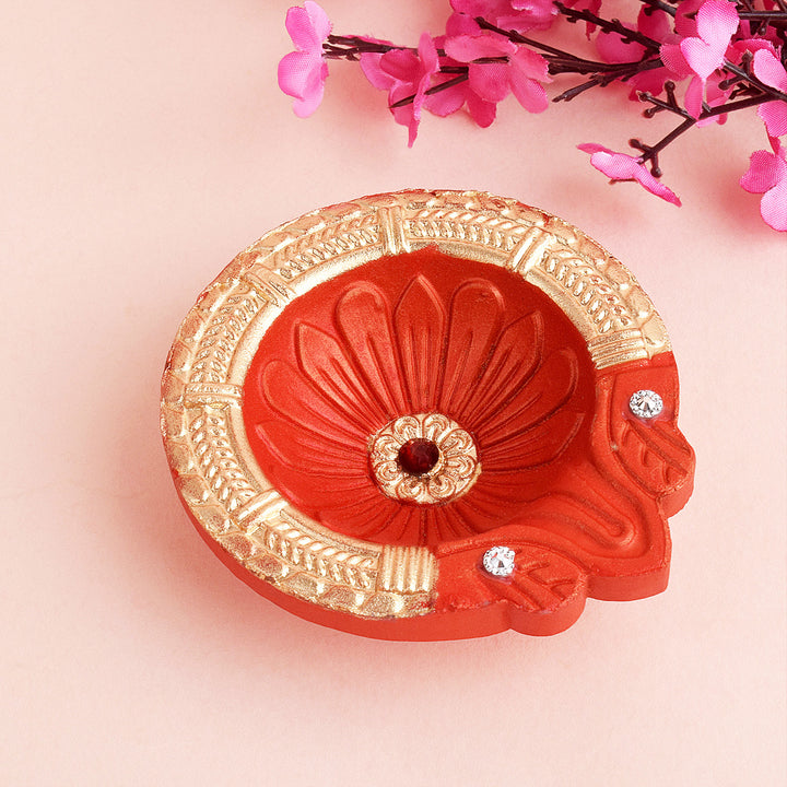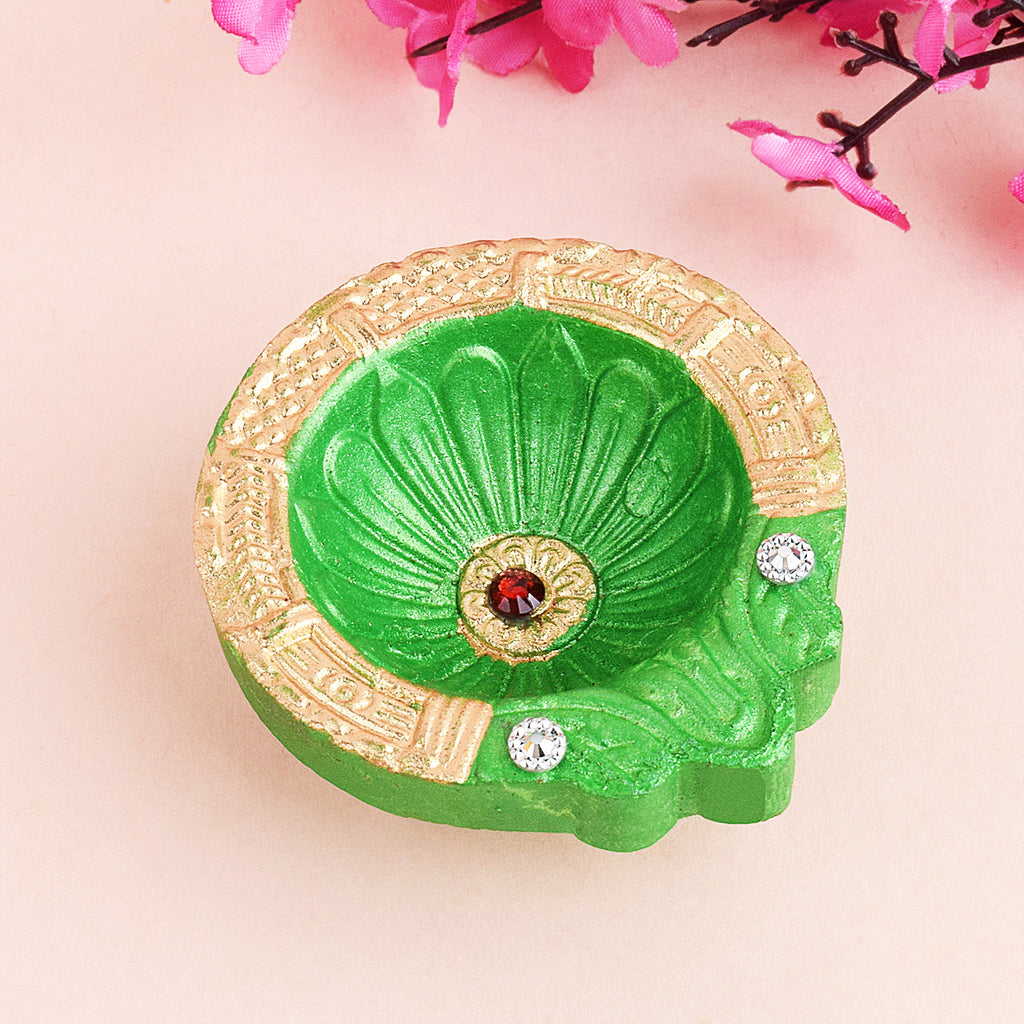 • Product Details: Material: Clay/Terracotta Dimensions: Regular Diya Height: 2.5cm, Length: 6.2cm, Large Diya Height: 3cm, Length: 8.5cm, Weight: 700gram, Finish Type: Glossy.